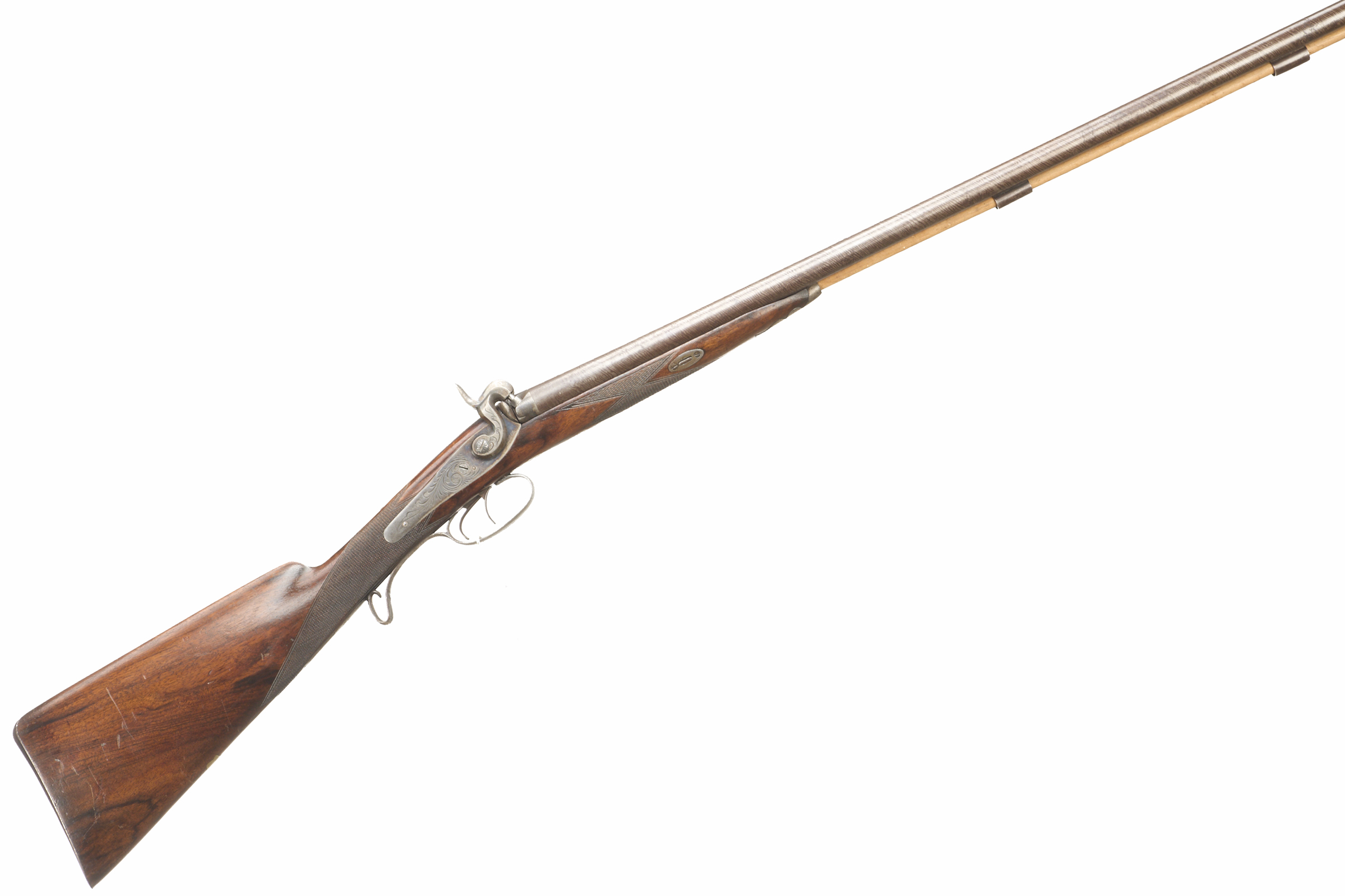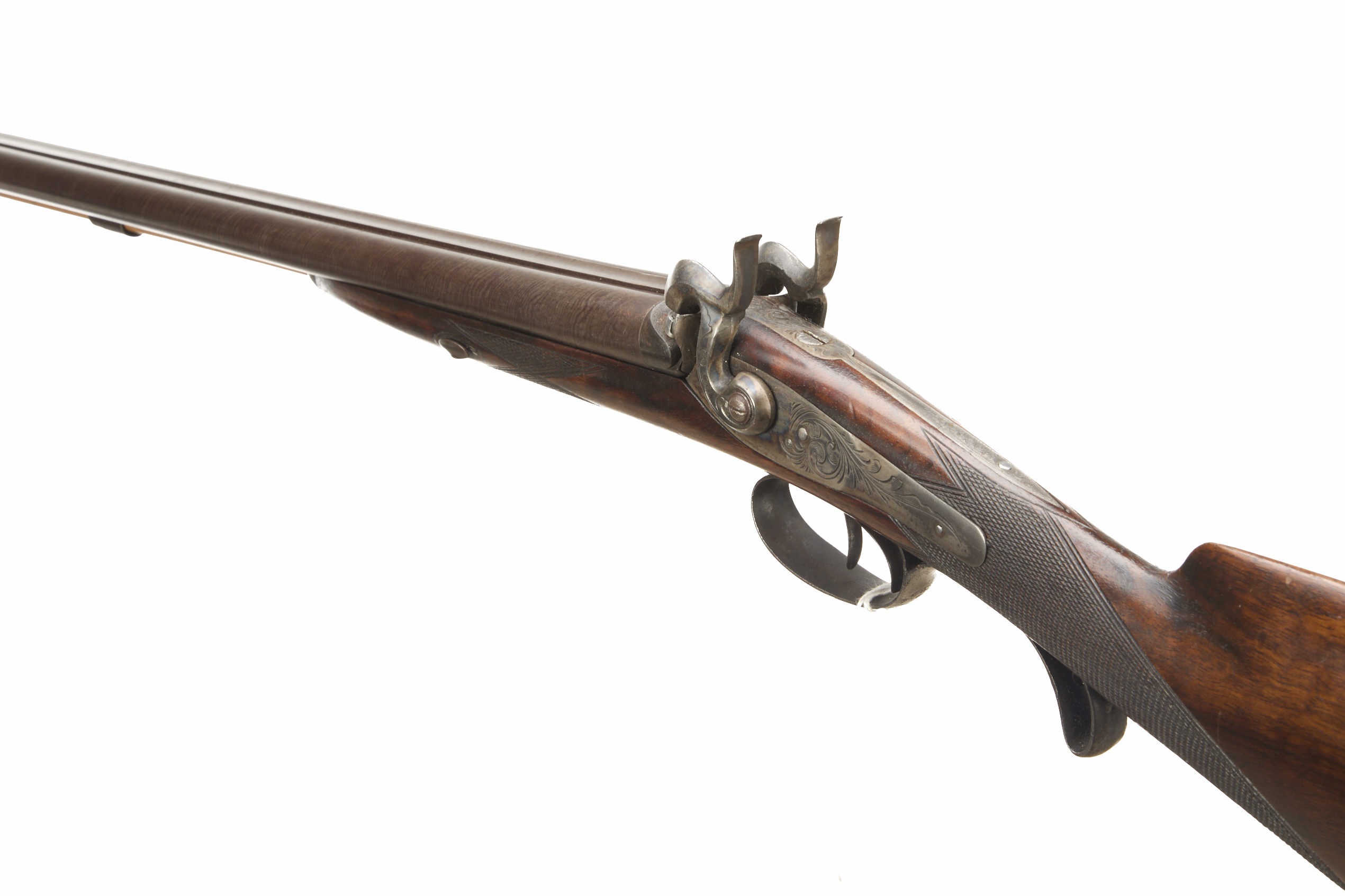 Metal butt plate, chequered straight grip and forend, back action engraved ‘BORDONI’ to the left and ‘BRESCIA’ to the right. New nipples. Bead foresight, Damascus barrels and rib and scrolled trigger guard.