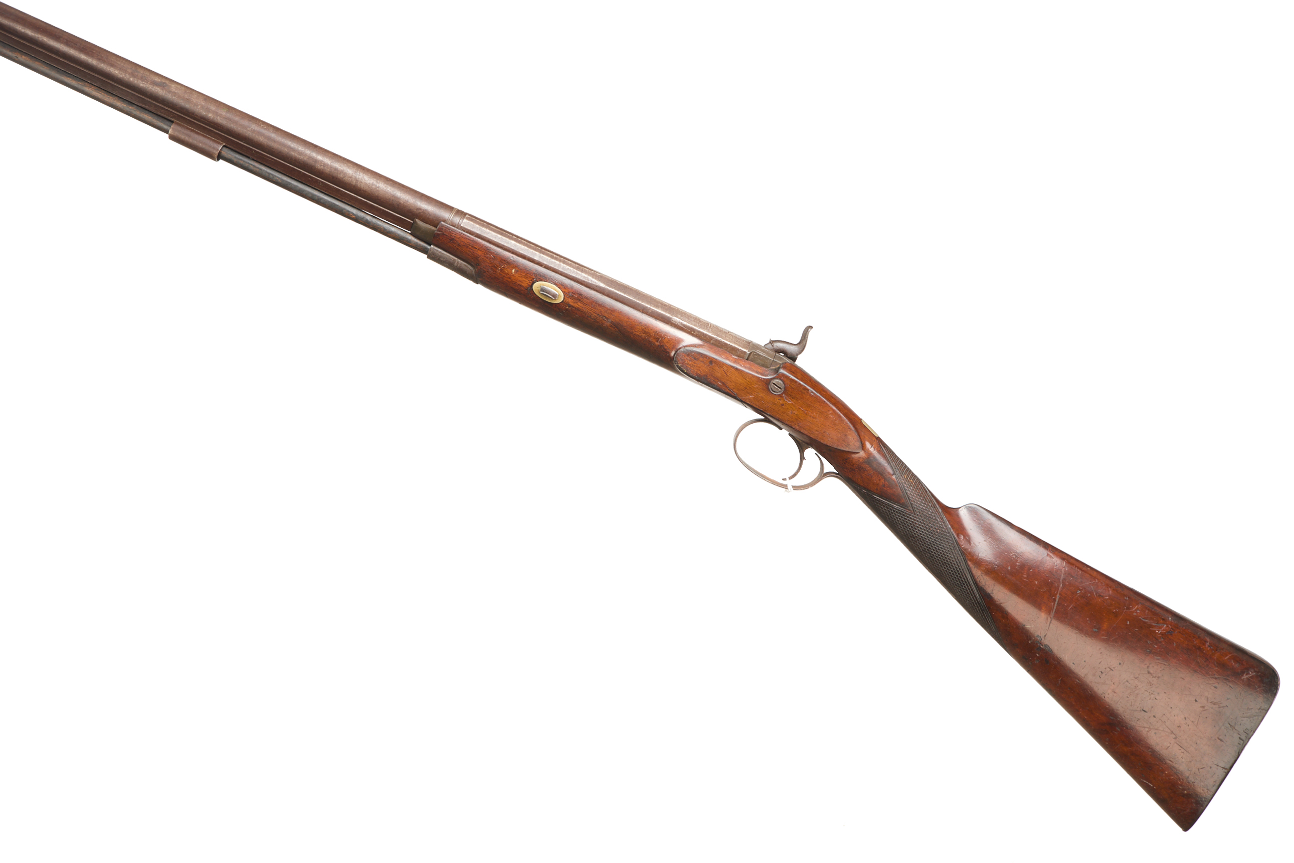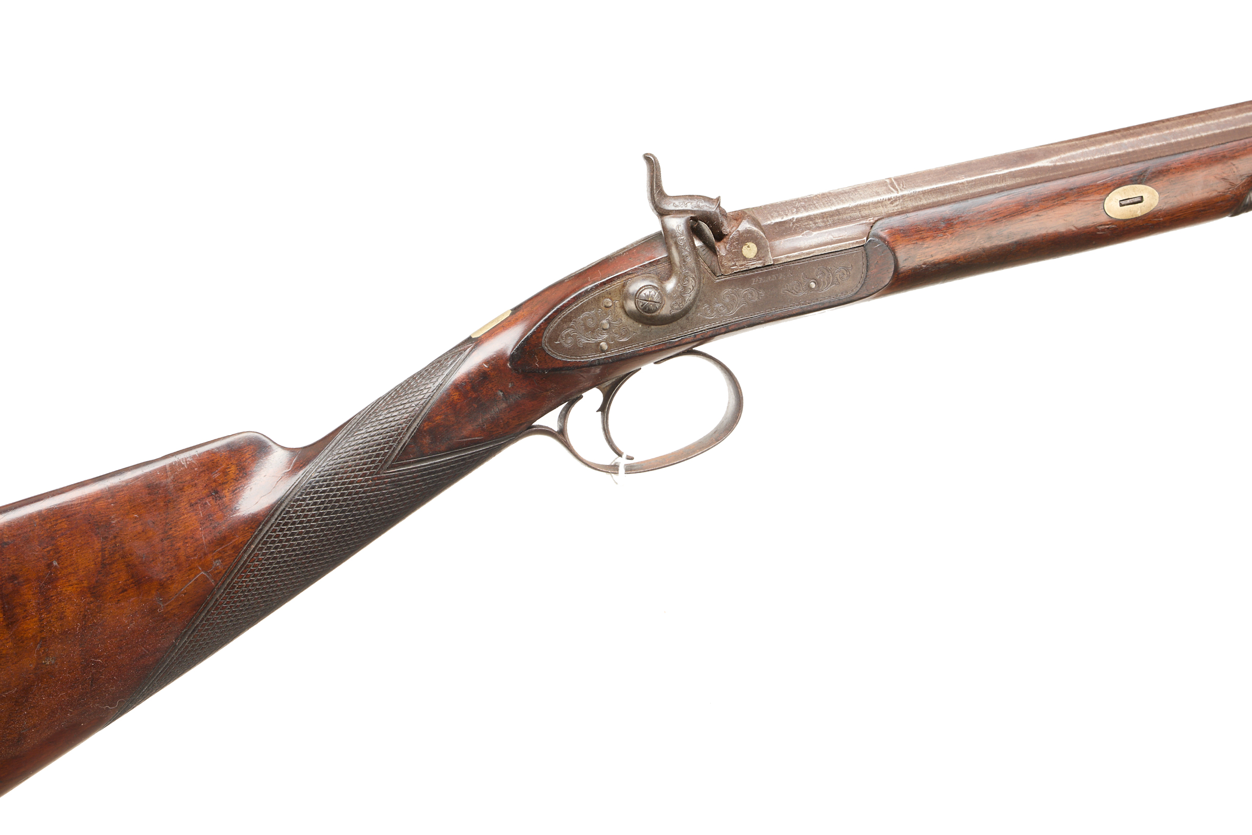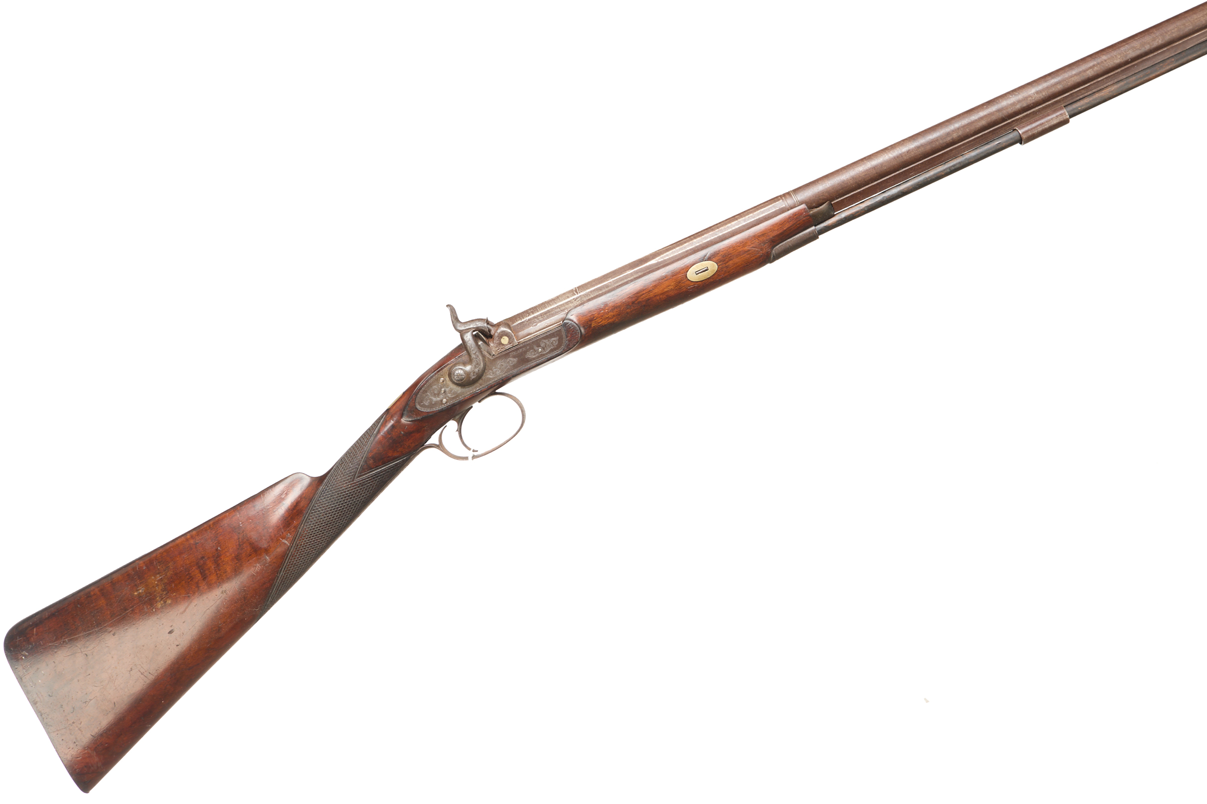 Metal butt plate, chequered straight grip, half-length stock, brass end cap, ram rod, simple engraving on lock, breach engraved ‘BLORE BOLTON’ , refurbished new nipple. Bead foresight. 2 stage barrel. Proved early 19th century.