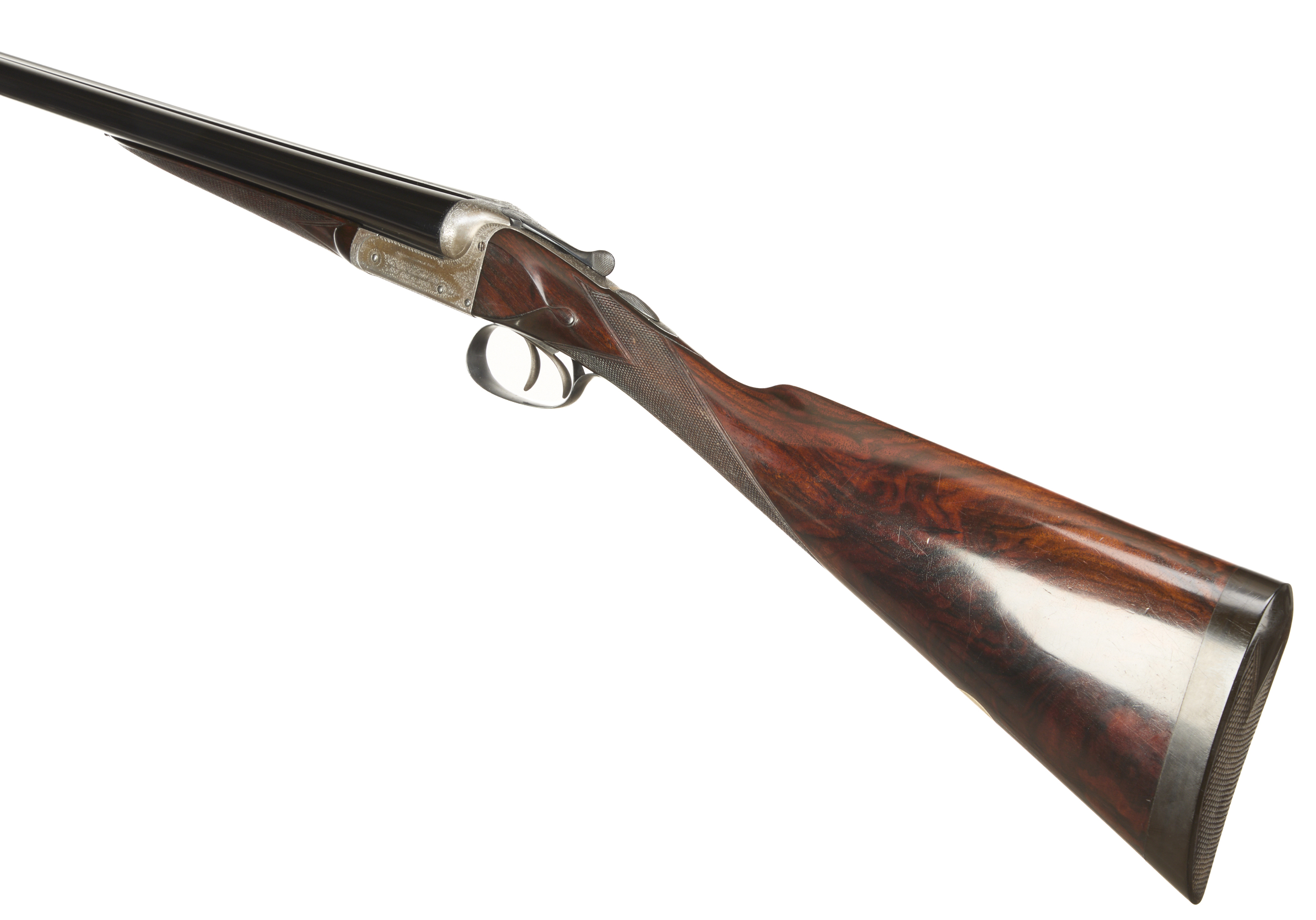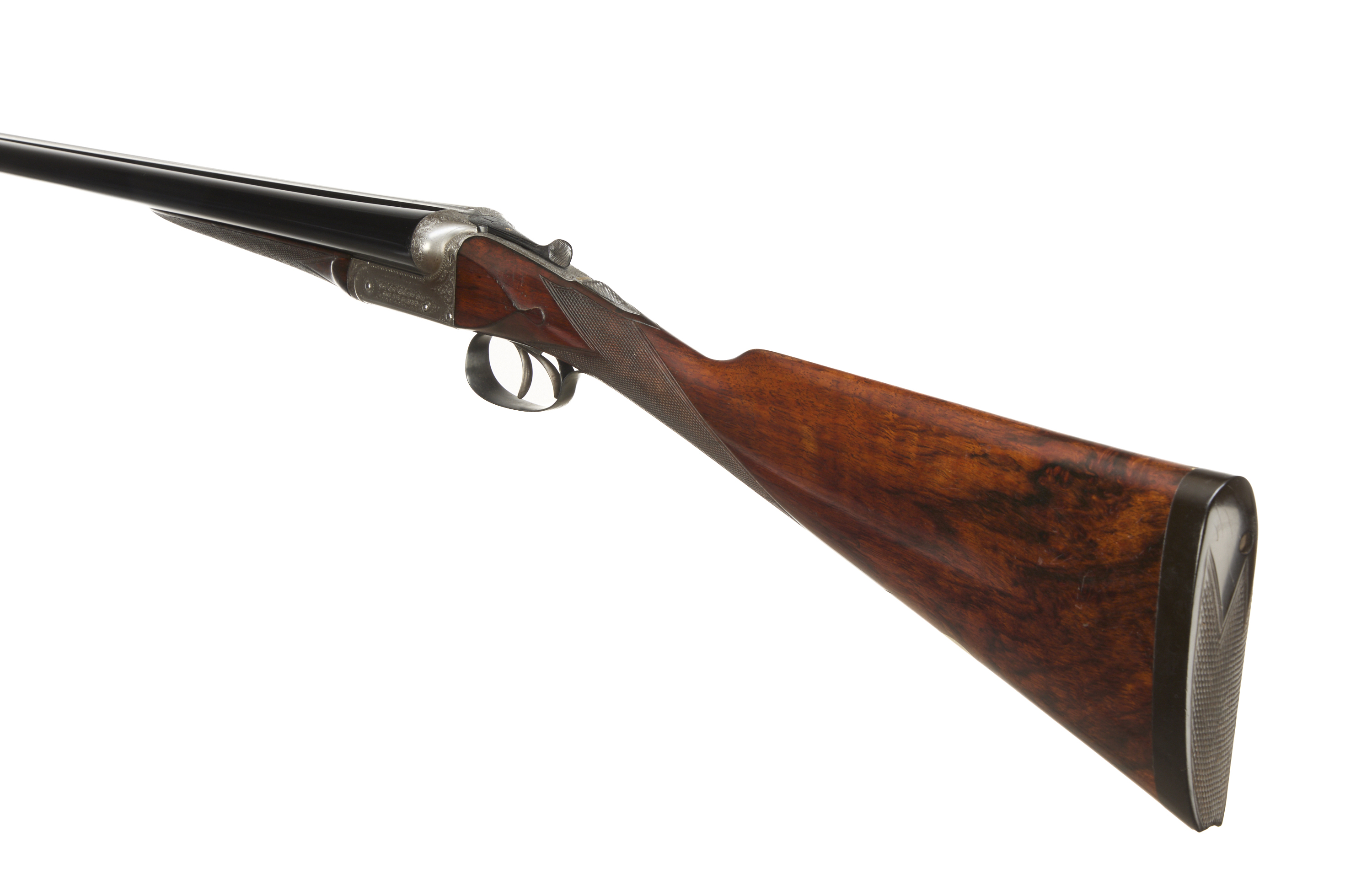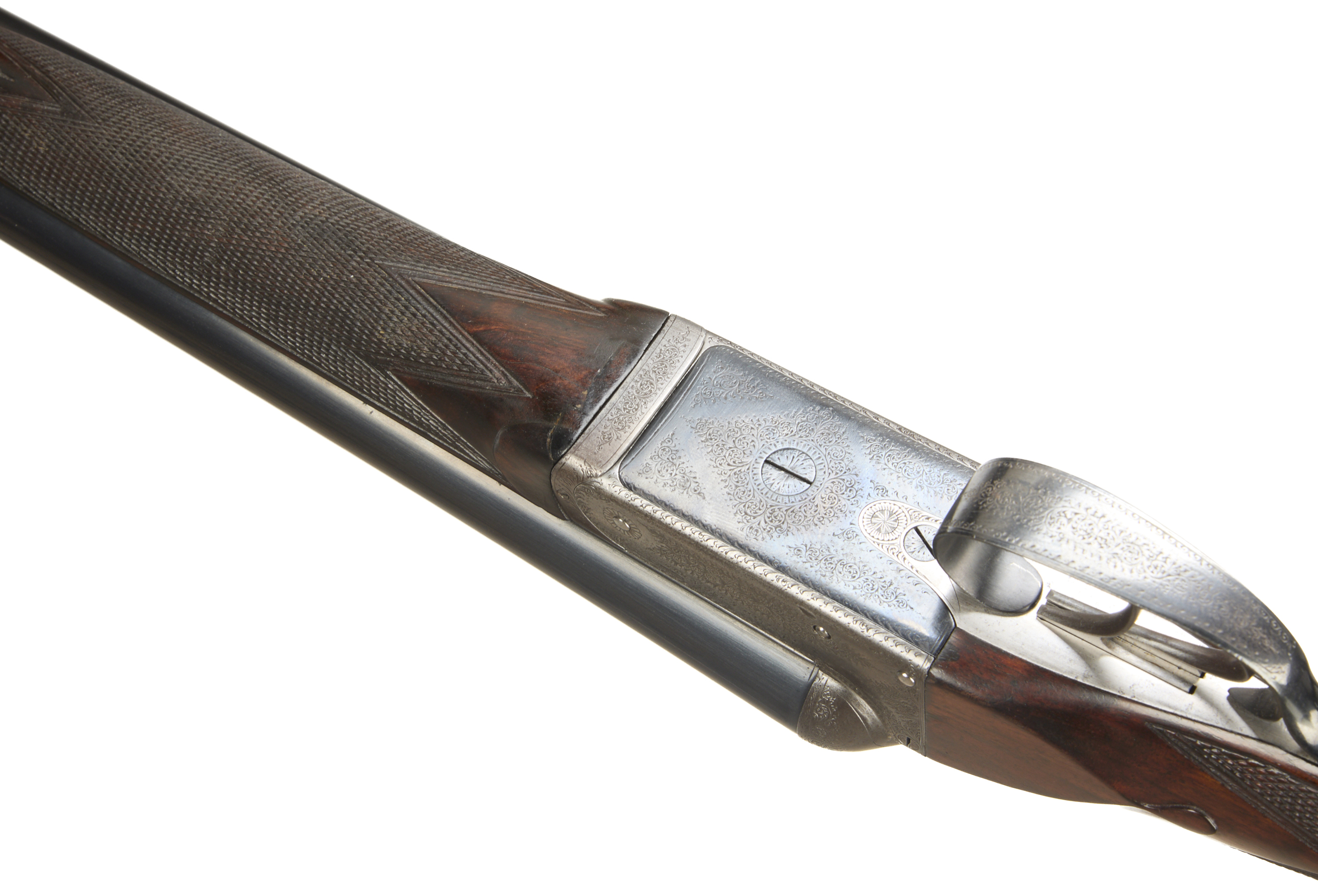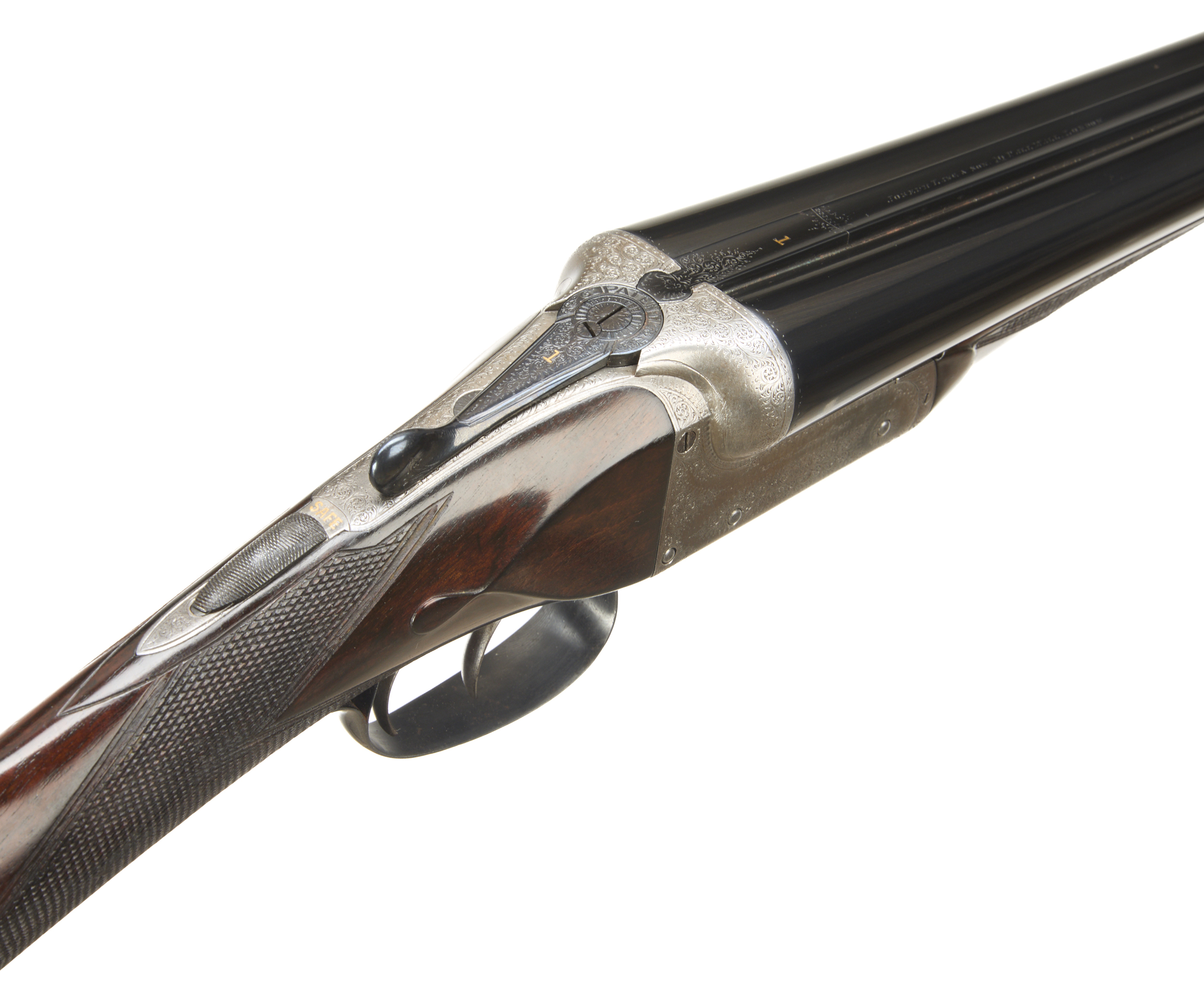 Extended ebonite chequered butt, richly figured, chequered straight grip and forend, the finials with ‘1’ and ‘2’ inlaid in gold as to the ribs. Broad, concave rib with embellishments to the breech end, engraved ‘JOSEPH LANG & SON. 10. PALL MALL. LONDON.’, doll’s head extension, treble grip action, intercepting sears, hold open top lever (with ‘1’ and ‘2’ inlaid in gold), automatic safety with ‘SAFE’ inlaid in gold. The action delicately engraved throughout with acanthus scrolling and delightful, varied, border detail. For 1892. Reproved London 1989.