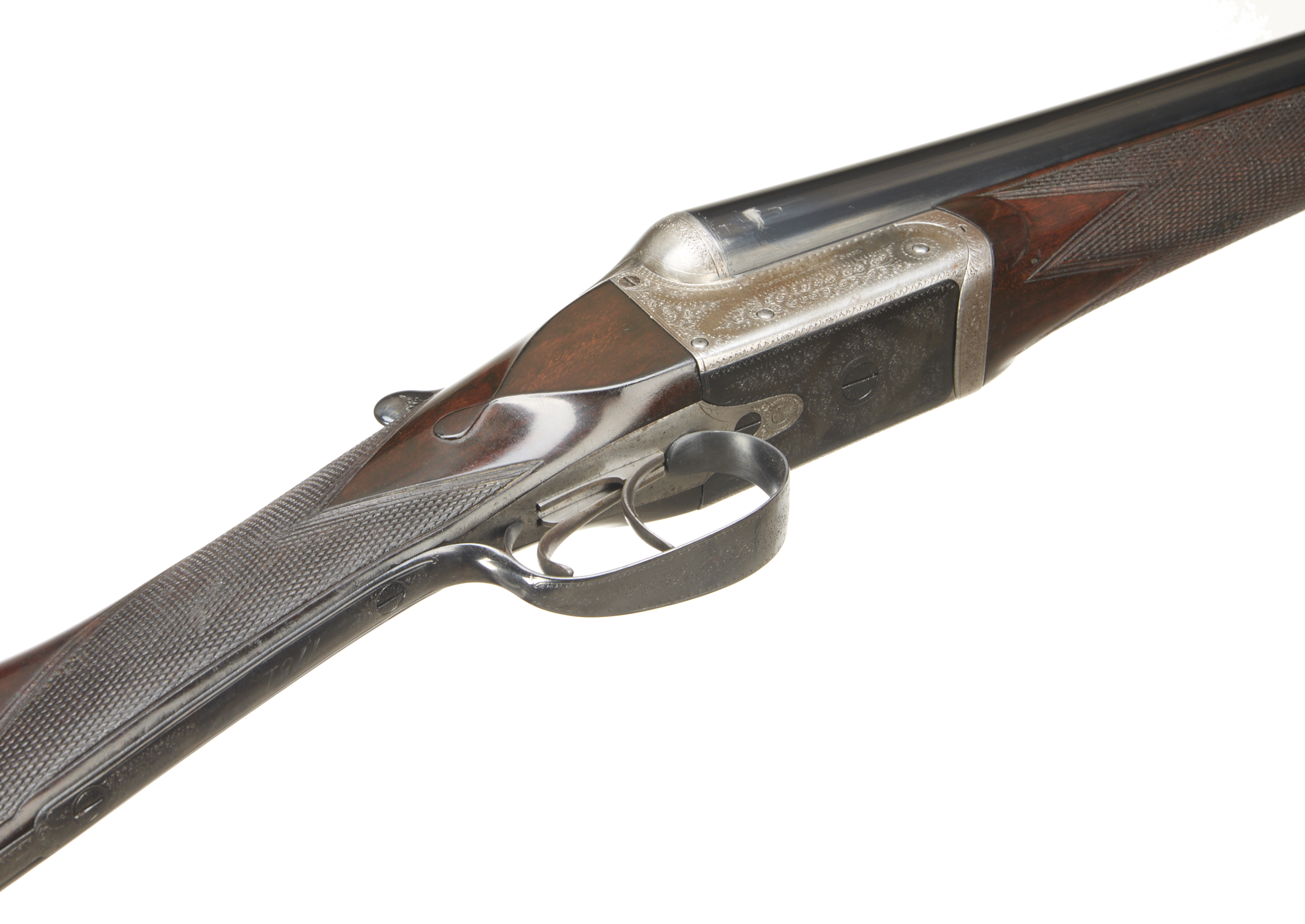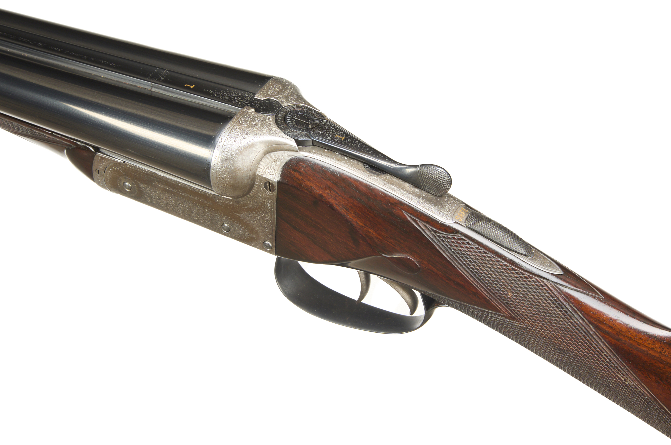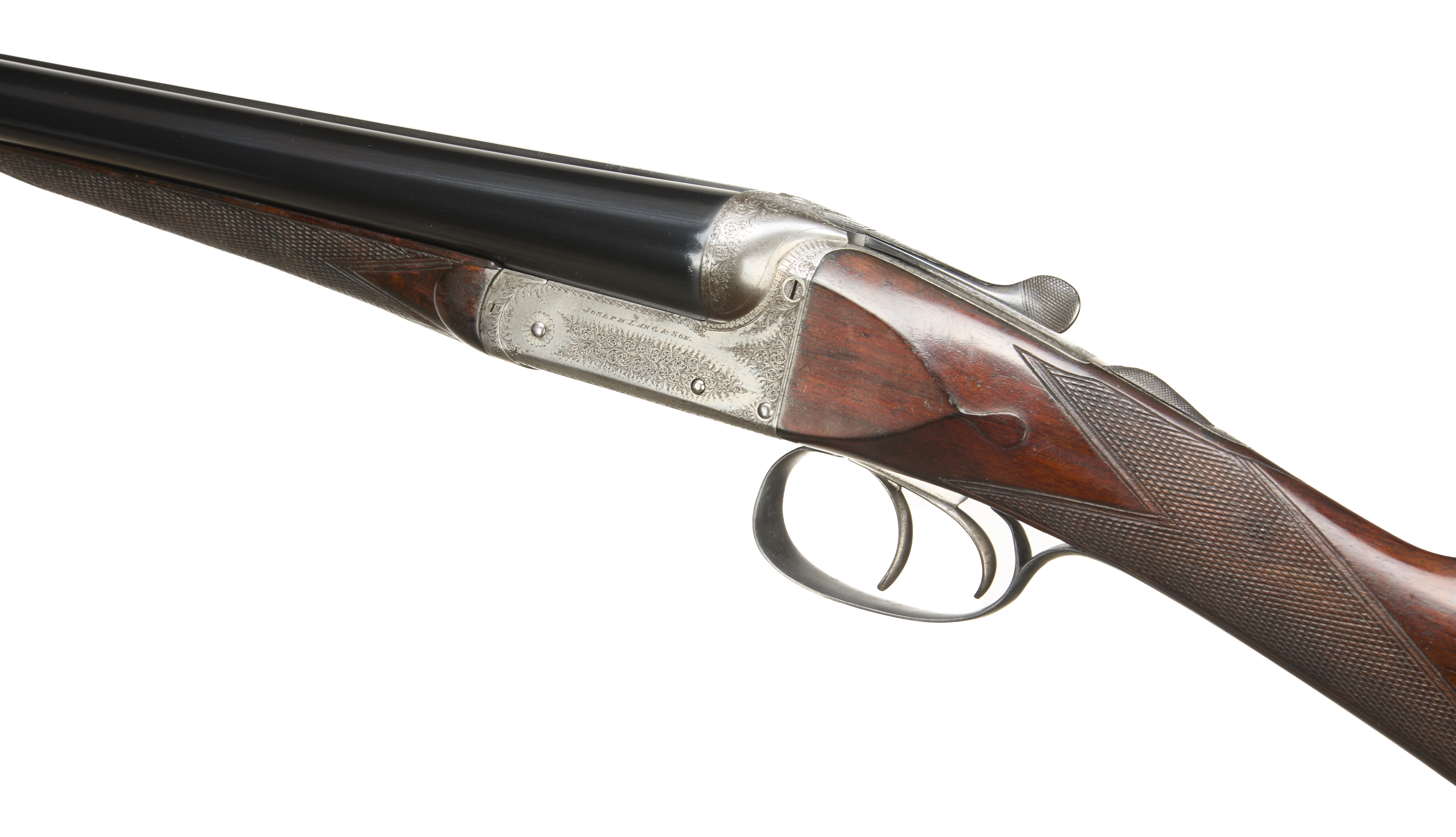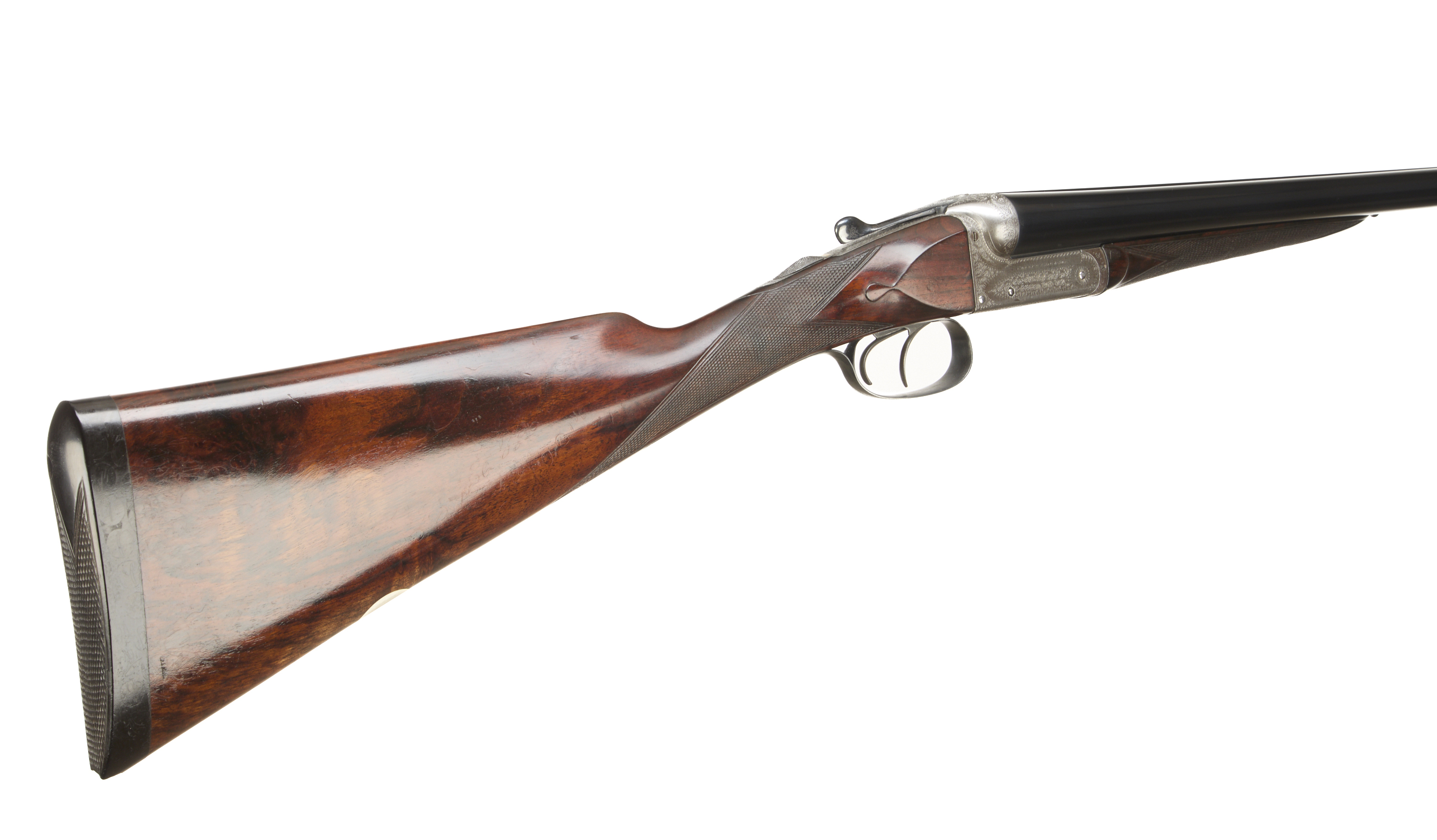 Extended ebonite chequered butt, richly figured, chequered straight grip and forend, the finials with ‘1’ and ‘2’ inlaid in gold as to the ribs. Broad, concave rib with embellishments to the breech end, engraved ‘JOSEPH LANG & SON. 10. PALL MALL. LONDON.’, doll’s head extension, treble grip action, intercepting sears, hold open top lever (with ‘1’ and ‘2’ inlaid in gold), automatic safety with ‘SAFE’ inlaid in gold. The action delicately engraved throughout with acanthus scrolling and delightful, varied, border detail. For 1892. Reproved London 1989.