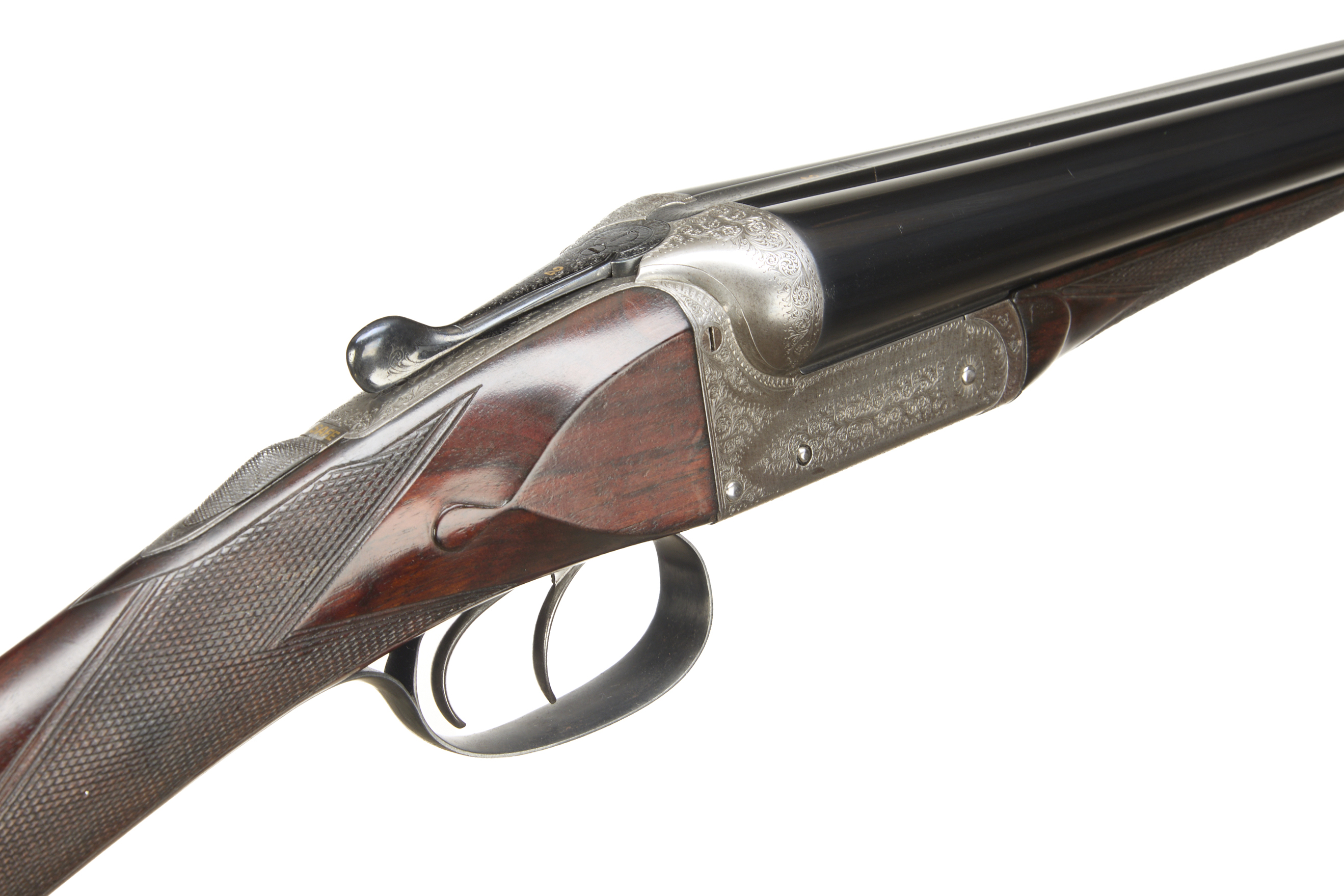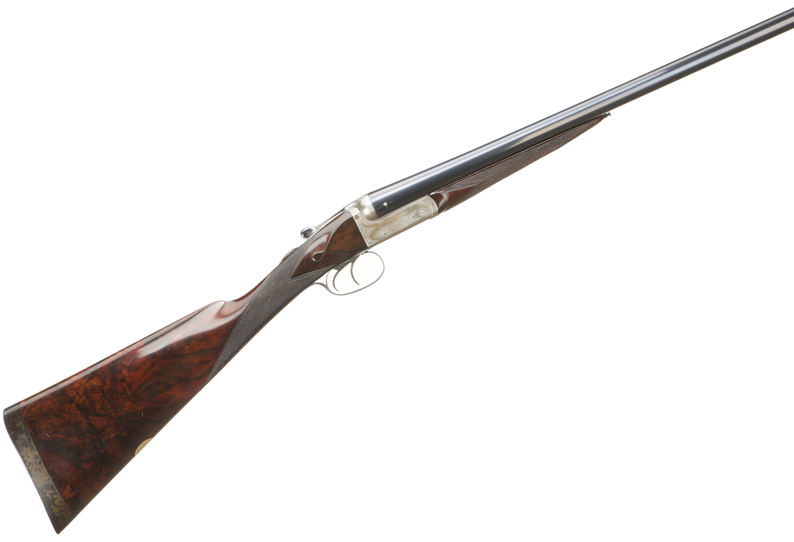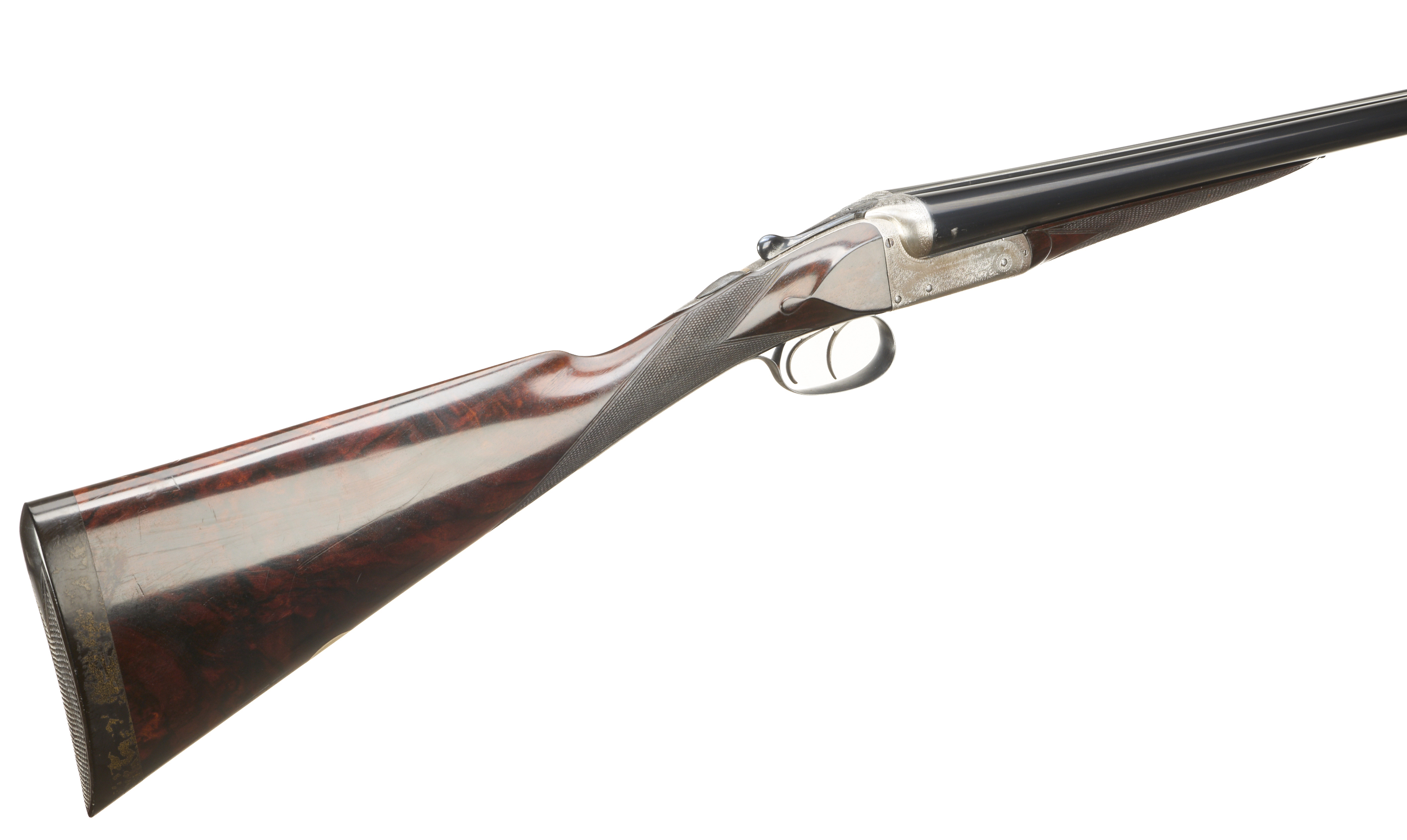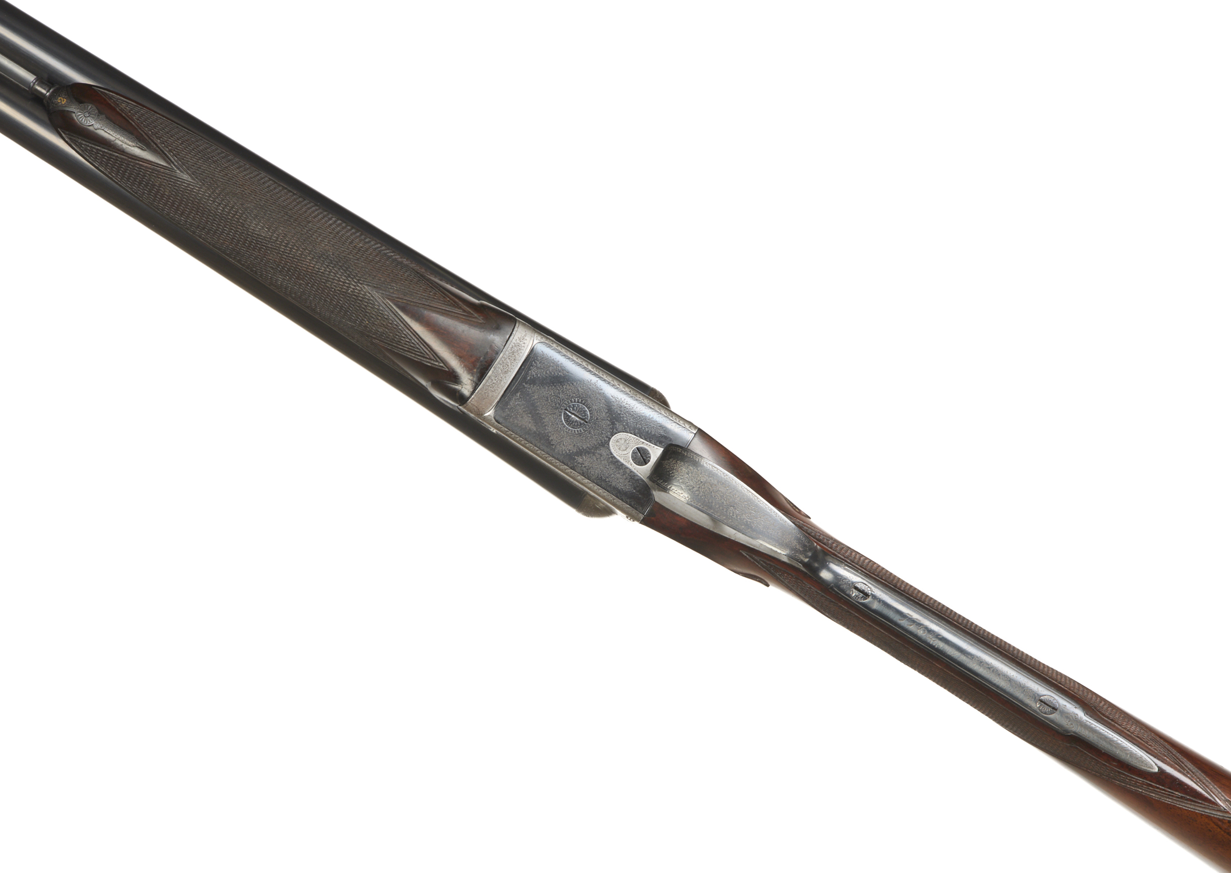 Extended ebonite chequered butt, richly figured, chequered straight grip and forend, the finials with ‘1’ and ‘2’ inlaid in gold as to the ribs. Broad, concave rib with embellishments to the breech end, engraved ‘JOSEPH LANG & SON. 10. PALL MALL. LONDON.’, doll’s head extension, treble grip action, intercepting sears, hold open top lever (with ‘1’ and ‘2’ inlaid in gold), automatic safety with ‘SAFE’ inlaid in gold. The action delicately engraved throughout with acanthus scrolling and delightful, varied, border detail. For 1892. Reproved London 1989.