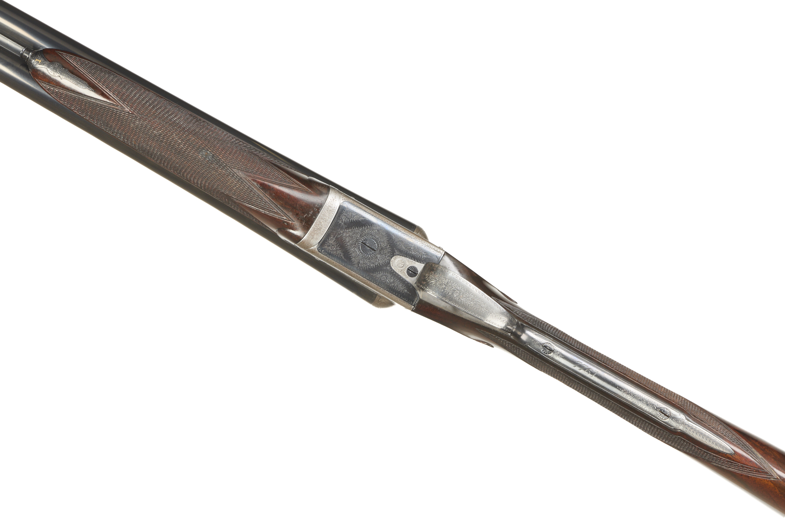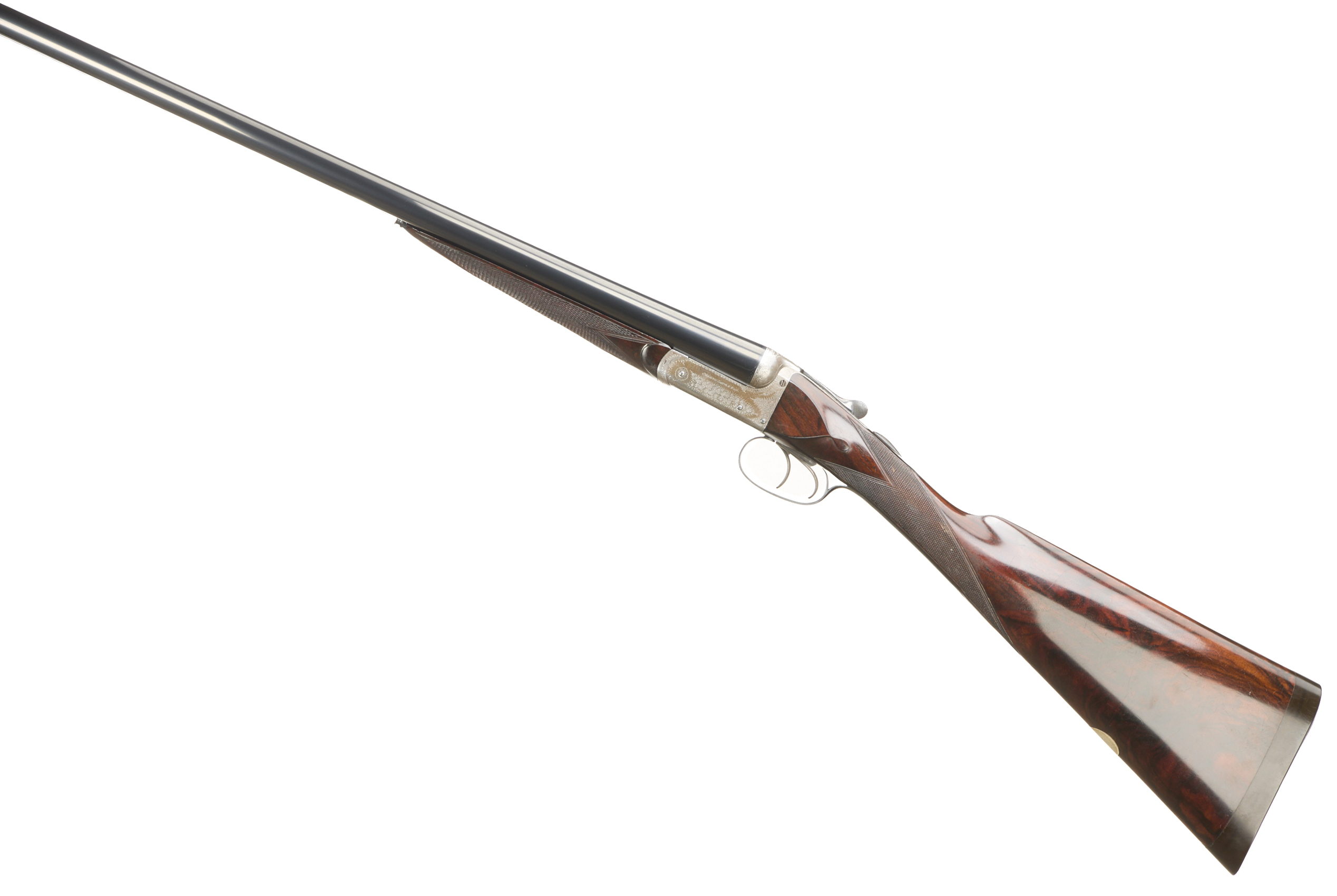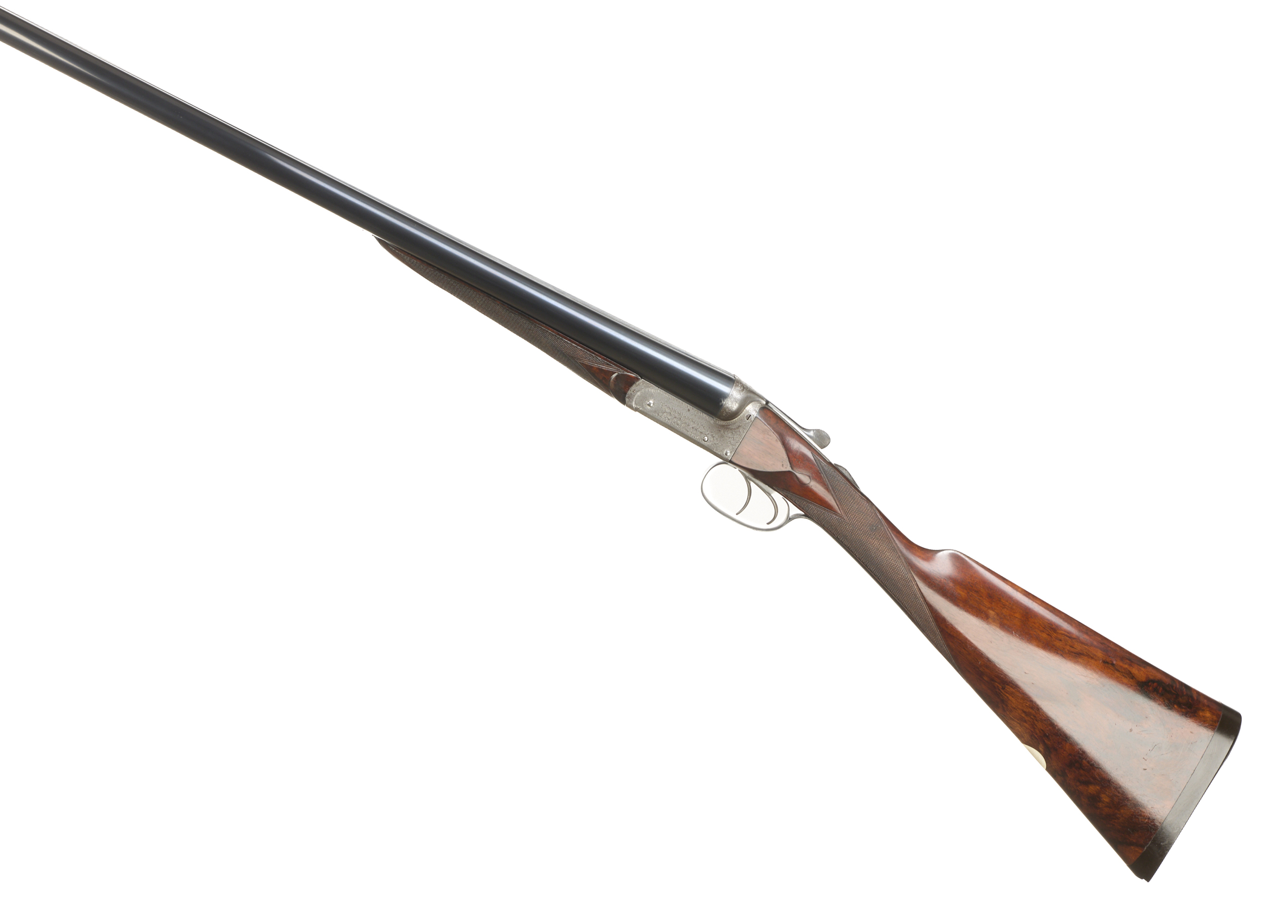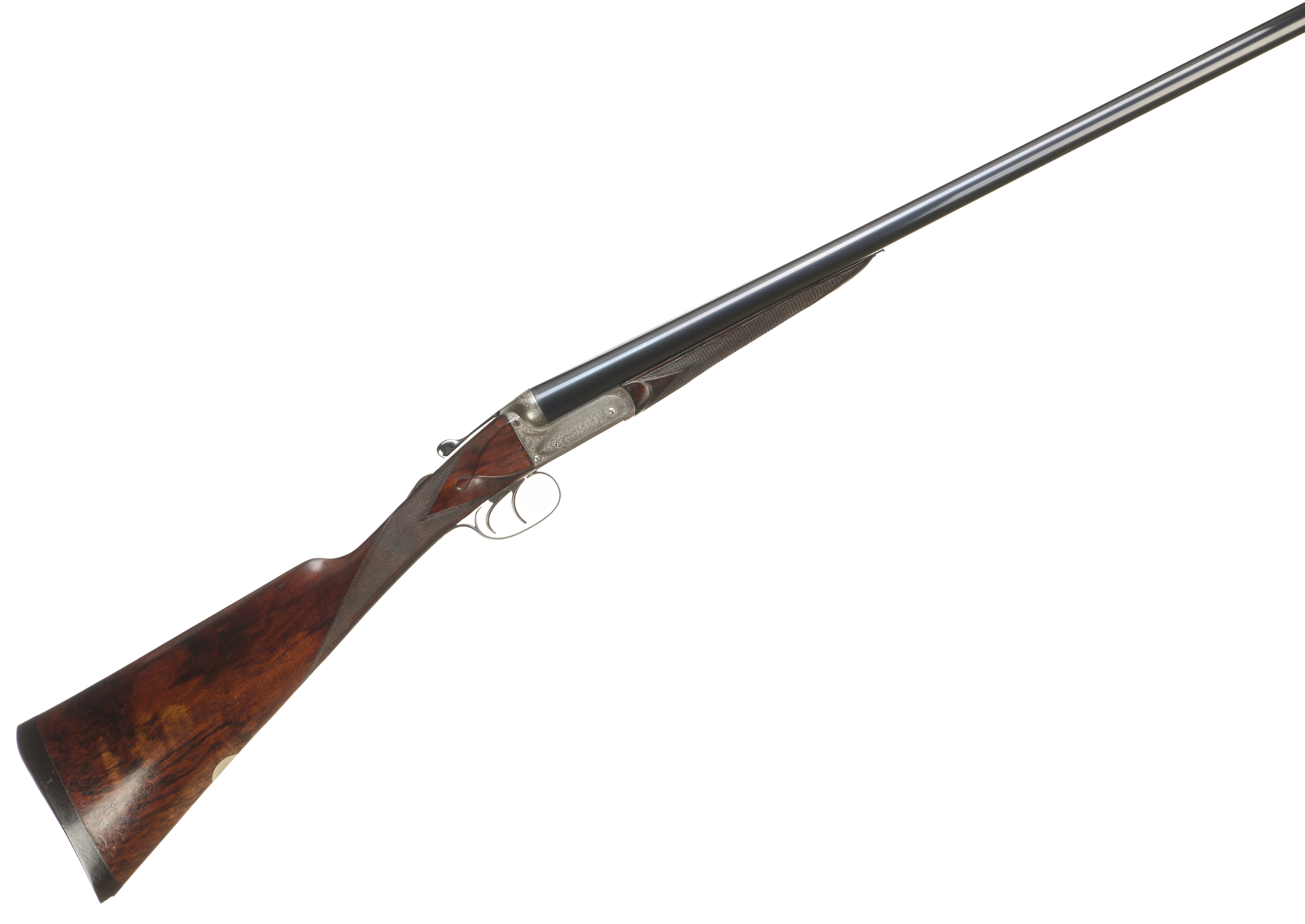 Extended ebonite chequered butt, richly figured, chequered straight grip and forend, the finials with ‘1’ and ‘2’ inlaid in gold as to the ribs. Broad, concave rib with embellishments to the breech end, engraved ‘JOSEPH LANG & SON. 10. PALL MALL. LONDON.’, doll’s head extension, treble grip action, intercepting sears, hold open top lever (with ‘1’ and ‘2’ inlaid in gold), automatic safety with ‘SAFE’ inlaid in gold. The action delicately engraved throughout with acanthus scrolling and delightful, varied, border detail. For 1892. Reproved London 1989.