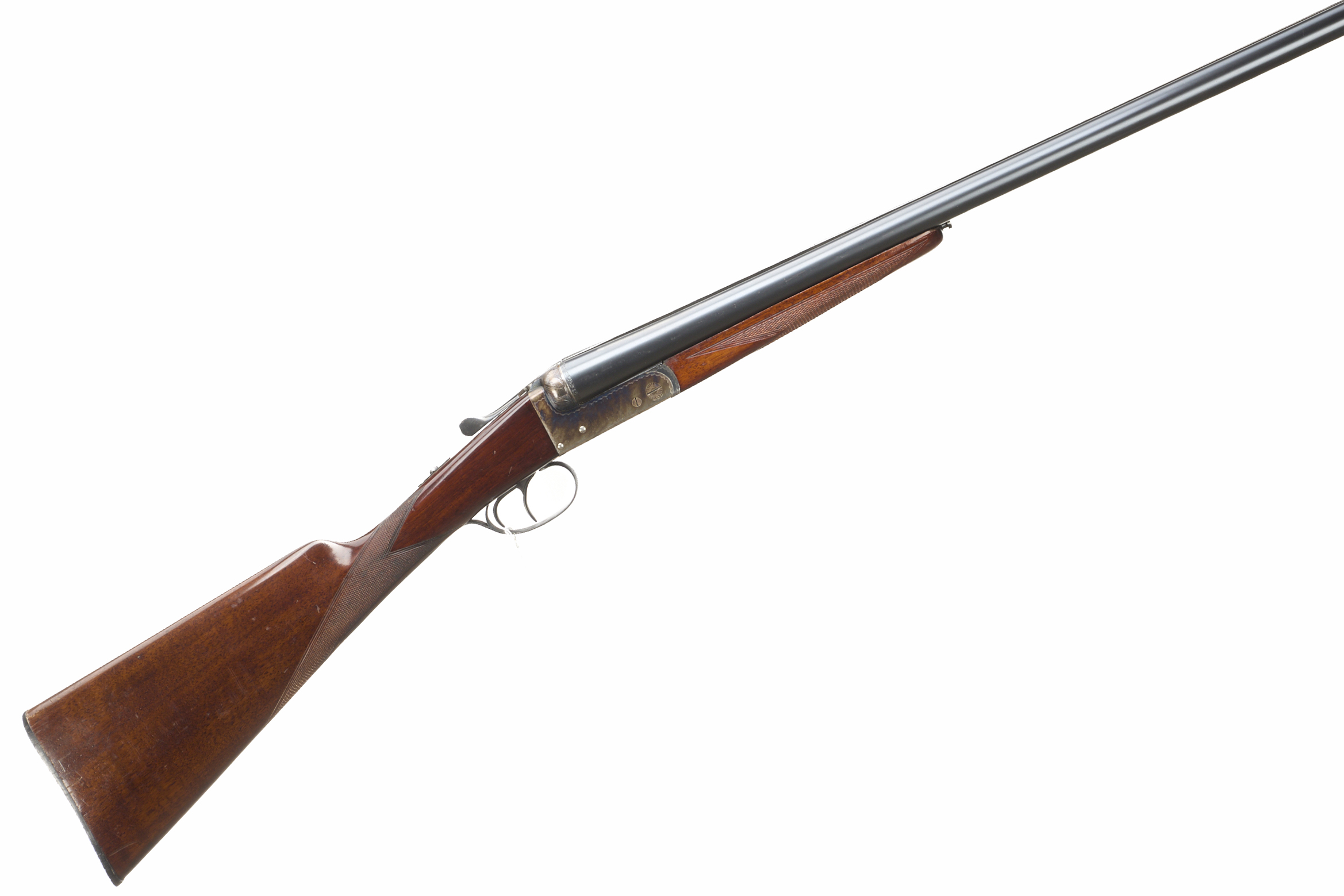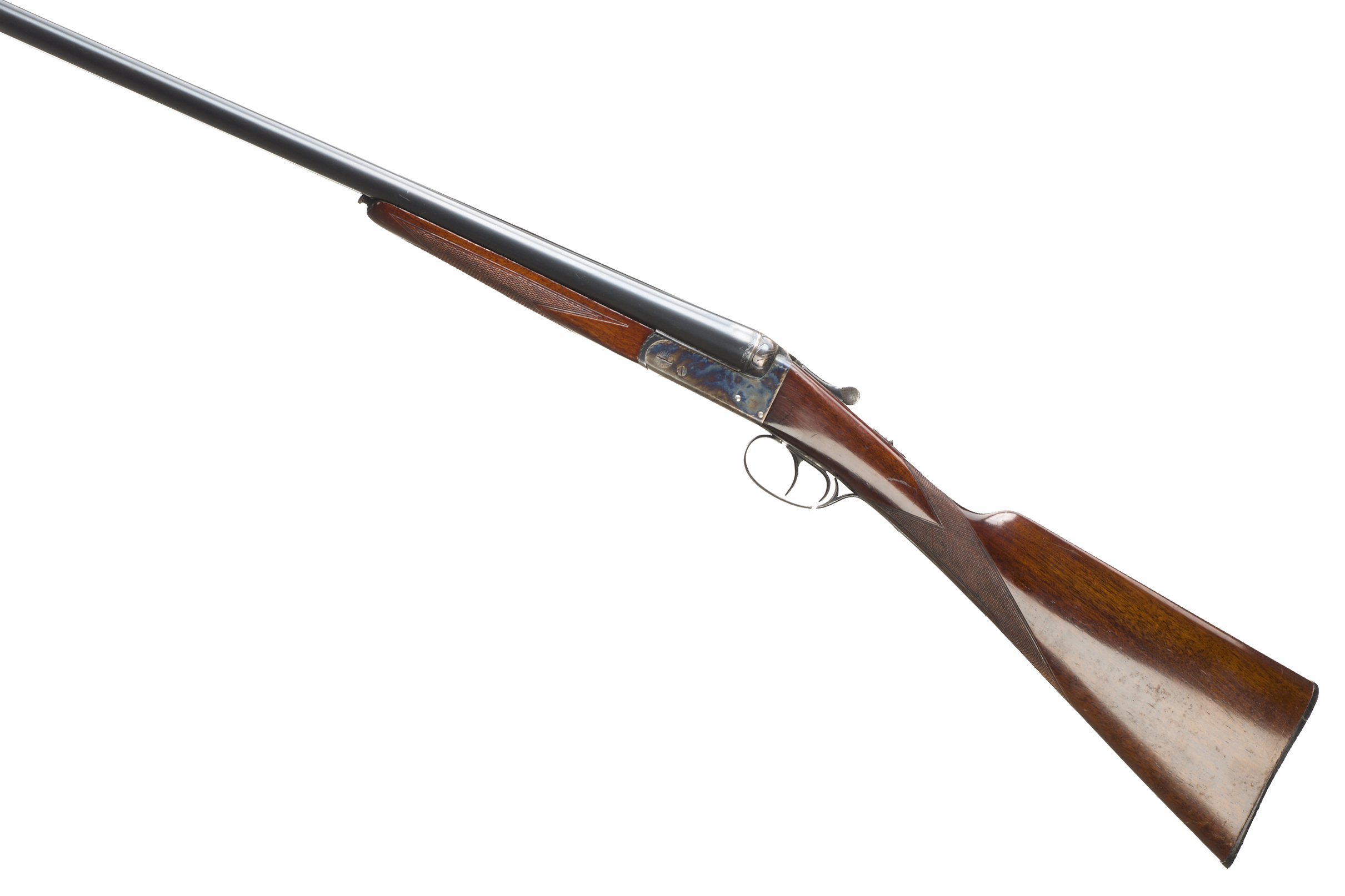 Chequered butt, straight grip and forend. Machined, tapered rib, top lever, automatic safety. The action plain retaining its original colour.