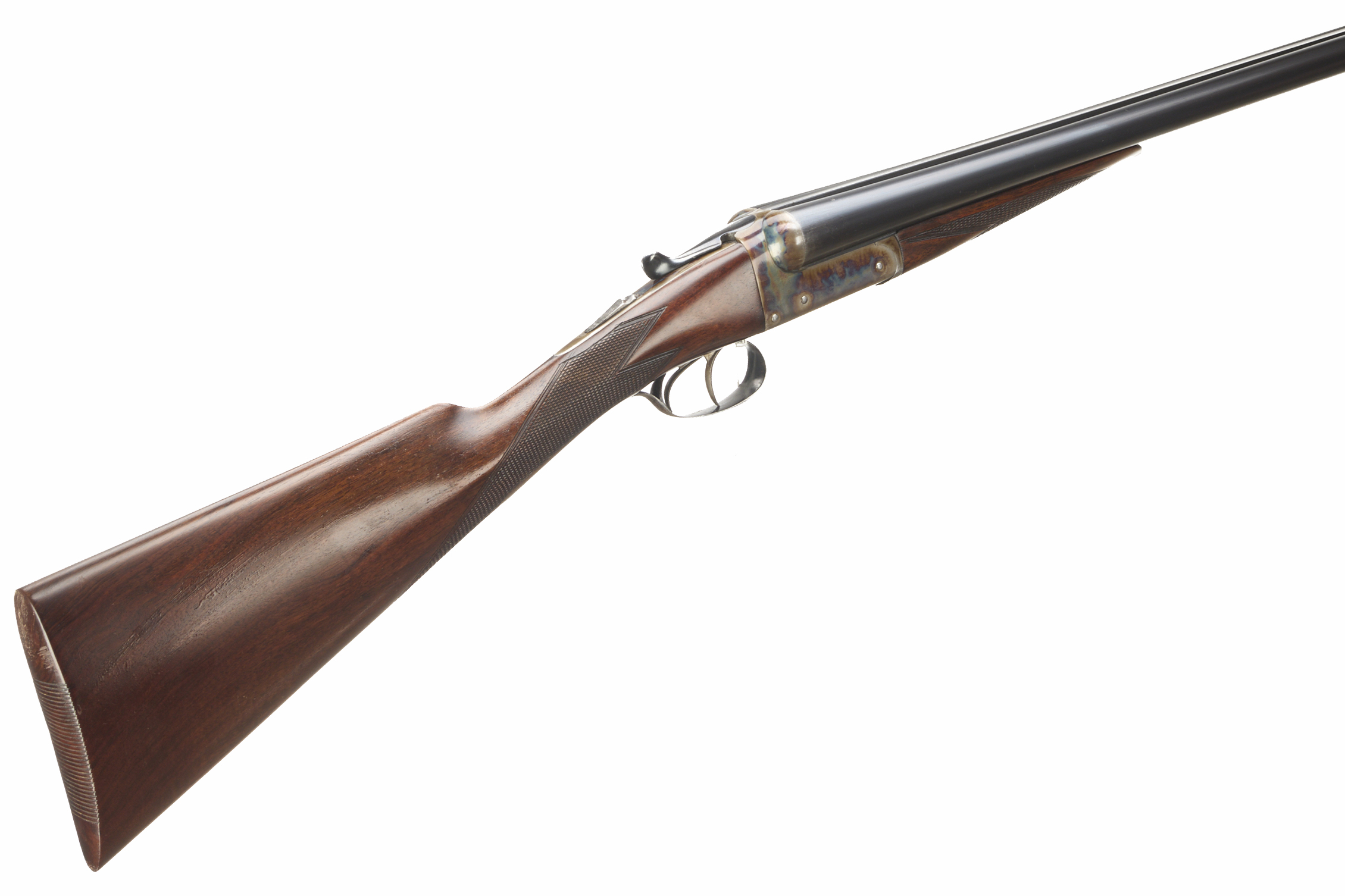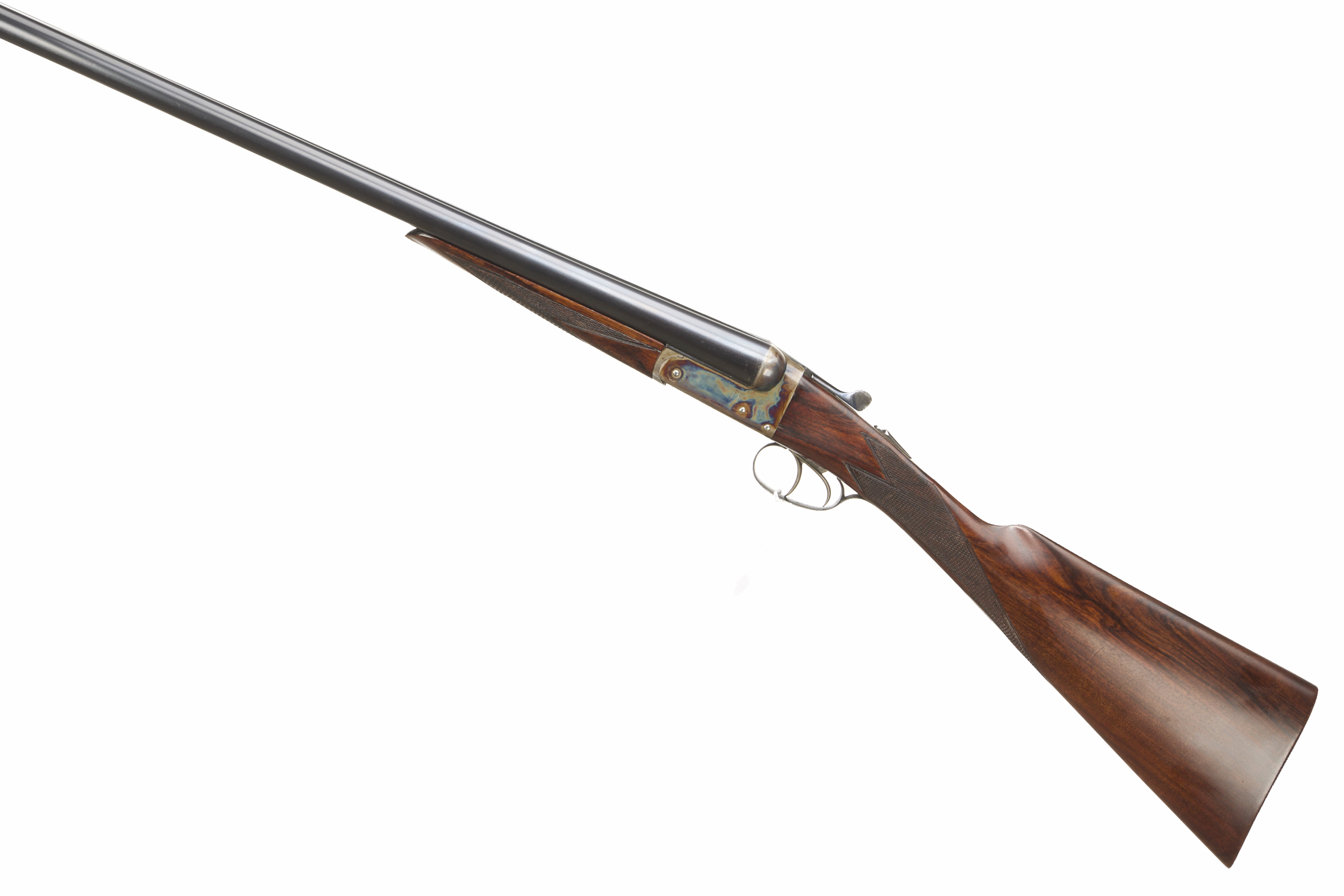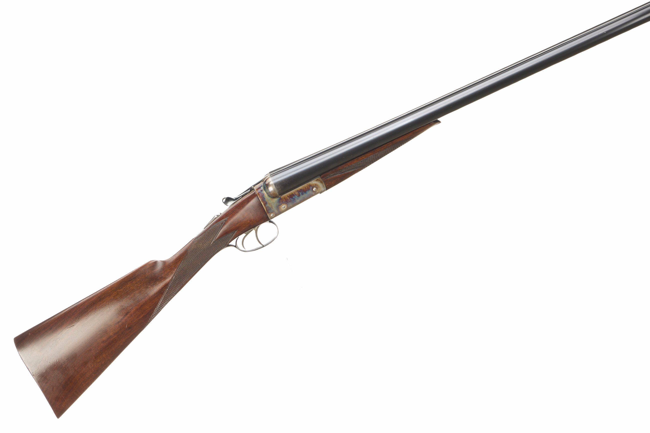 Ribbed extension to butt, chequered straight grip and forend. Tapered, concave rib, engraved ‘ARTHUR ALLAN LTD.GLASGOW’, top lever, automatic safety with ‘S’ inlaid. The action plain with much original colour remaining. For 1937.