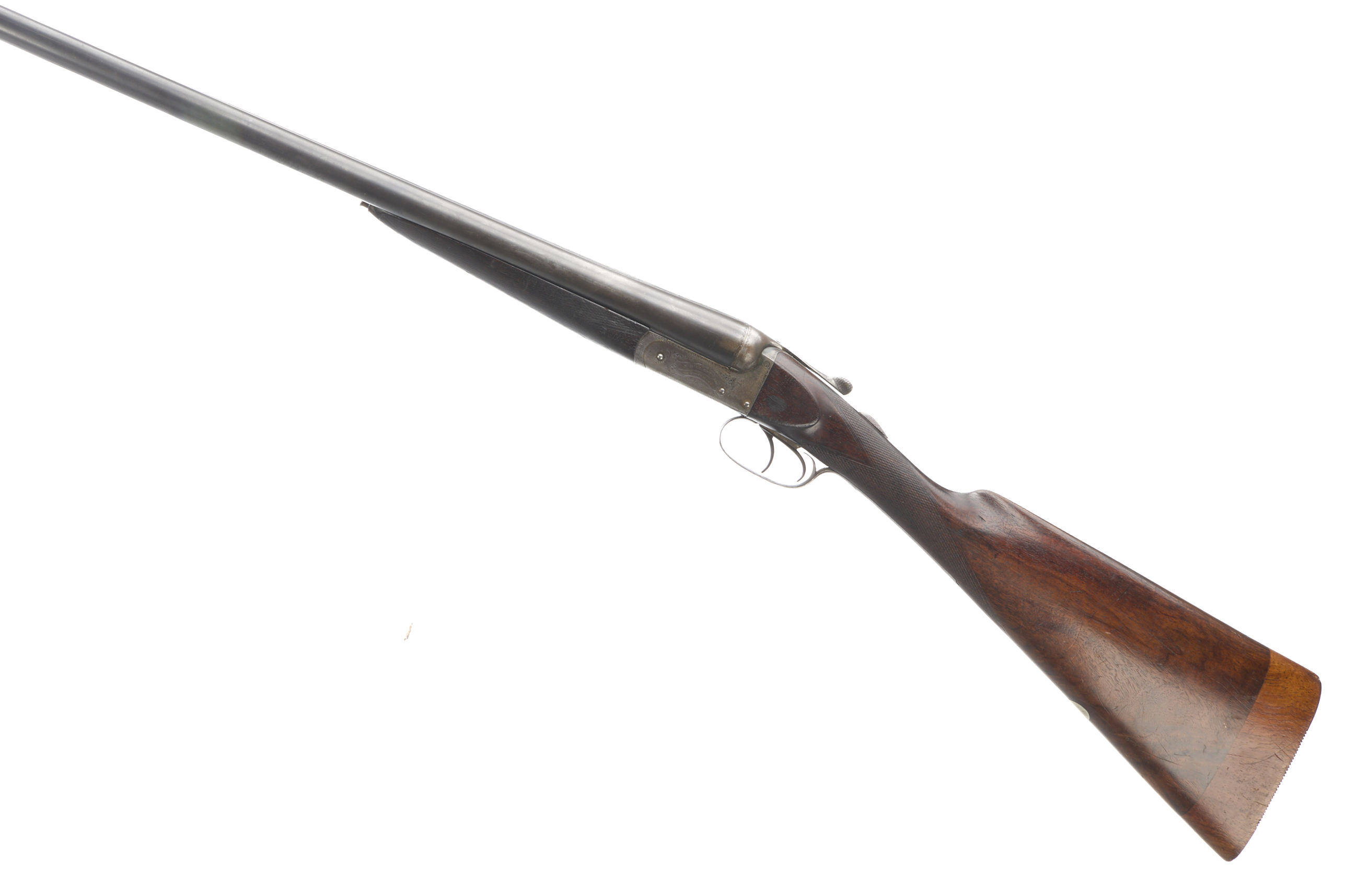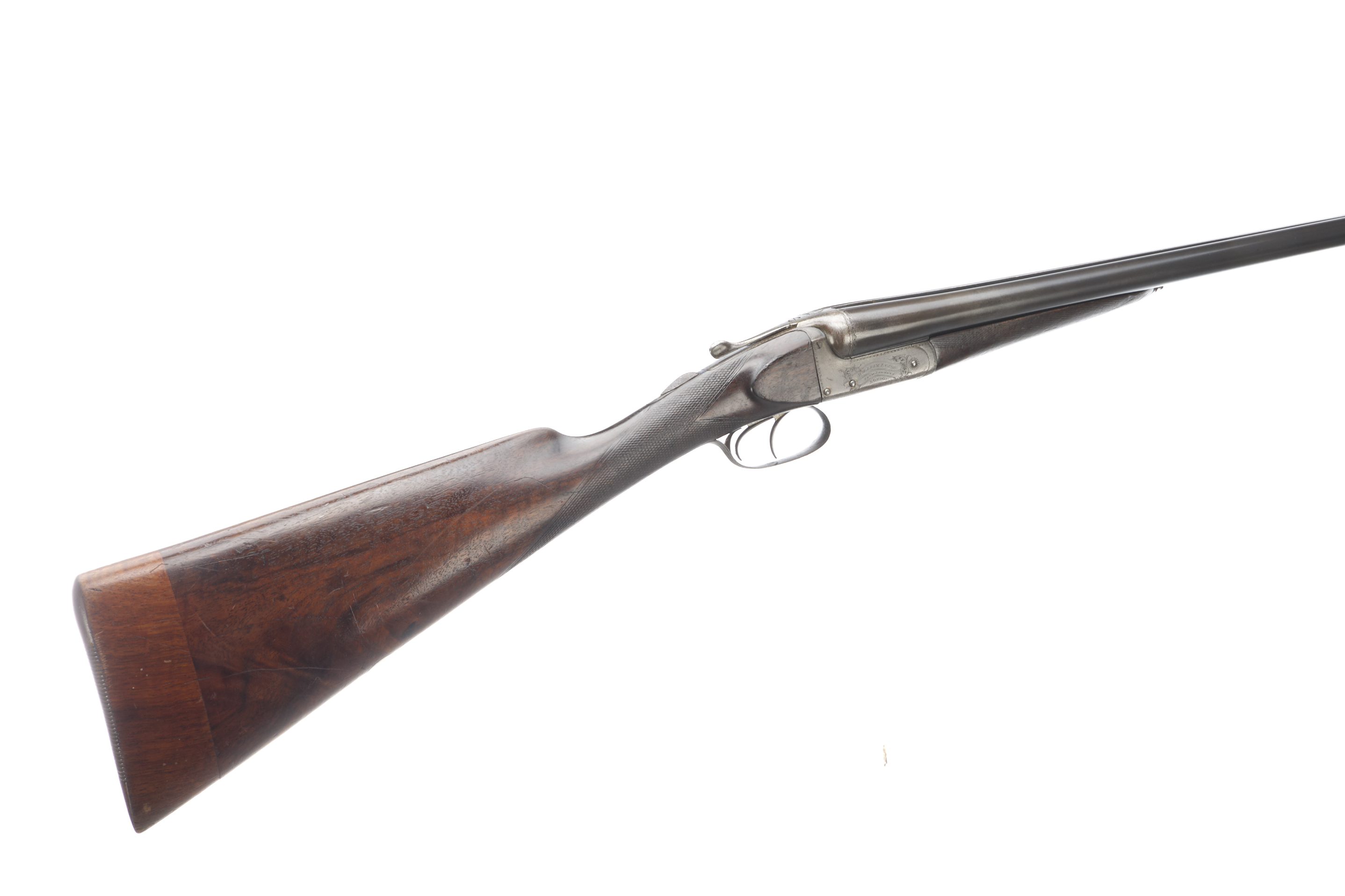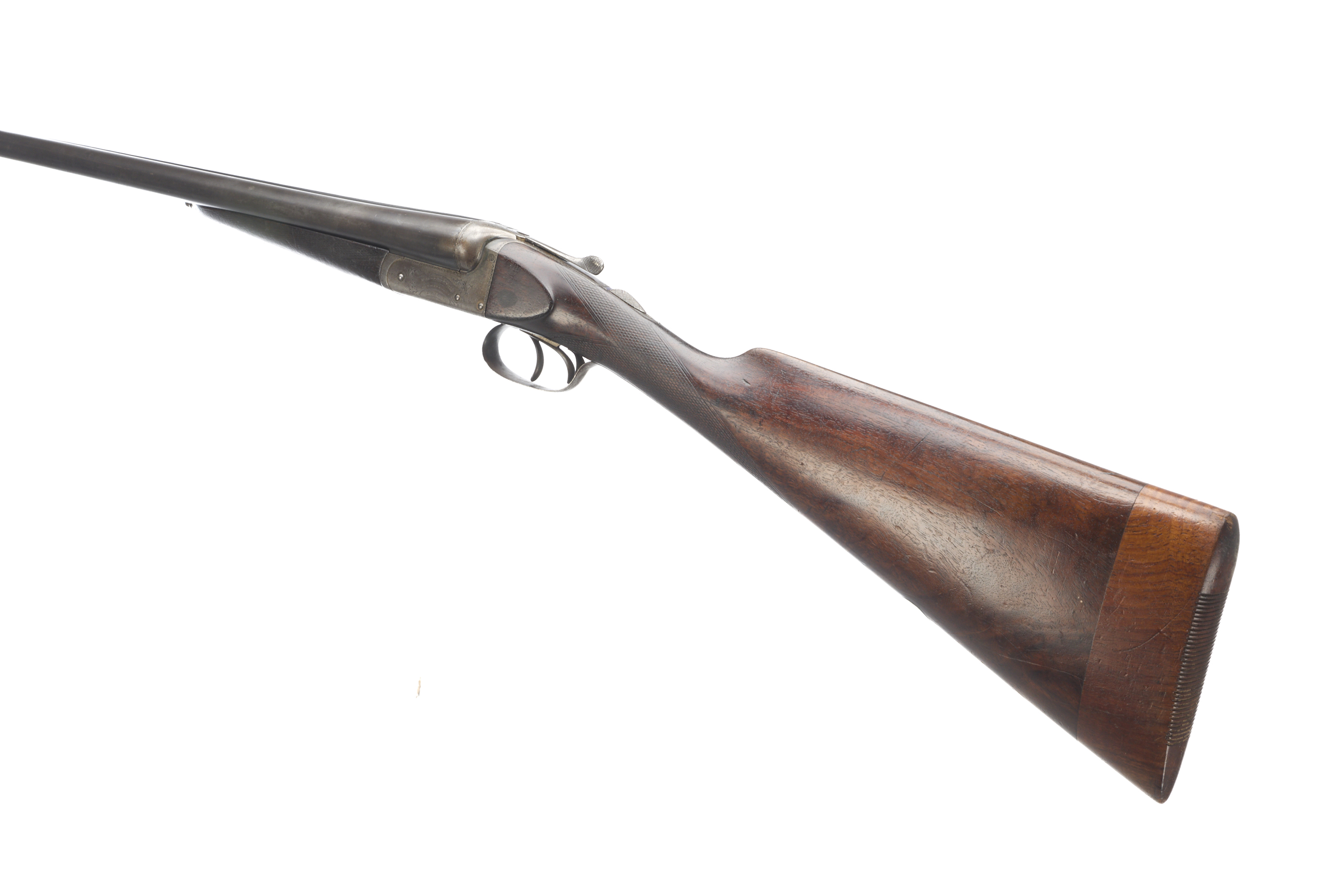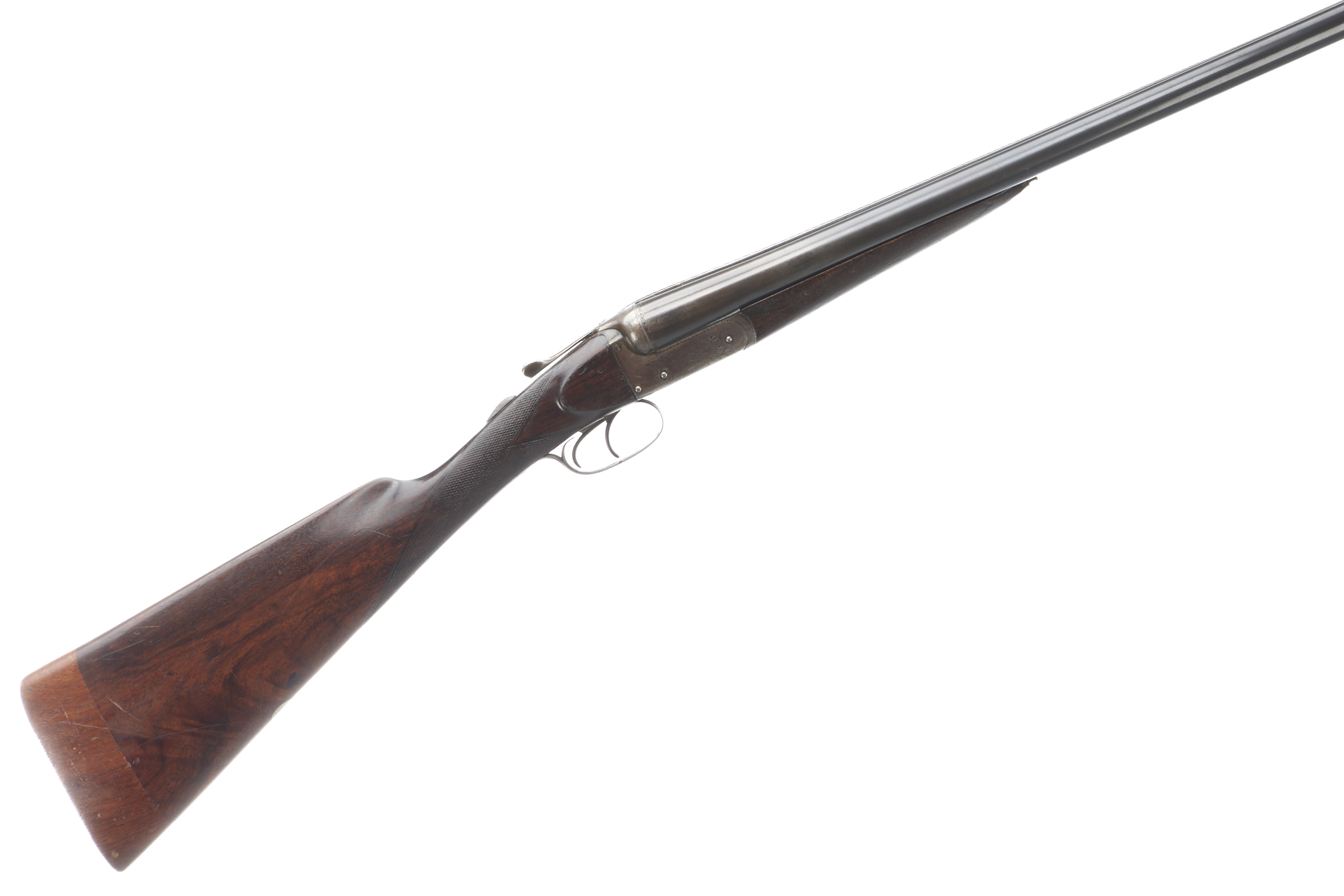 Ribbed, well-matched extension to butt, chequered rounded grip and forend. Tapered, concave rib engraved ‘BARRELS BY THOS TURNER & Sons LTD READING’. Doll’s head extension, treble-grip action, top lever, automatic safety with ‘SAFE’ inlaid in lapis. The action with acanthus highlighted scrolls. For 1893. Sleeved 1960.