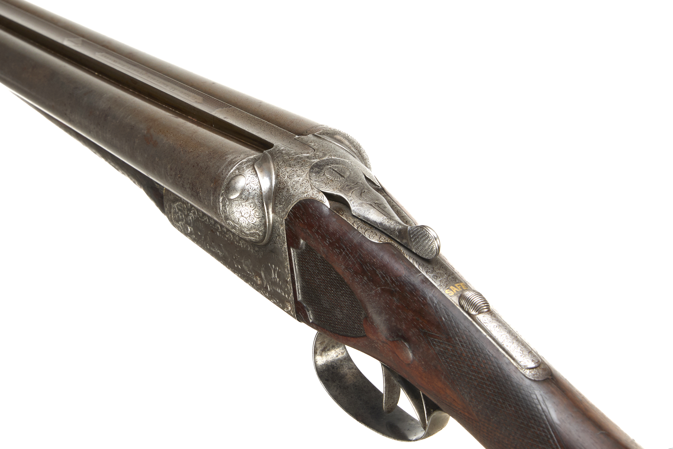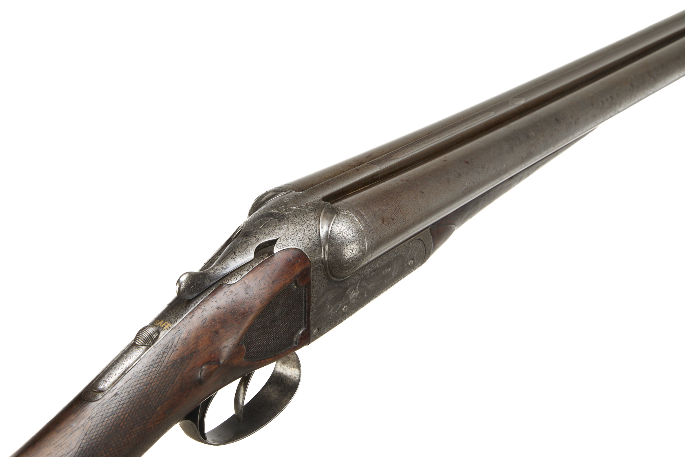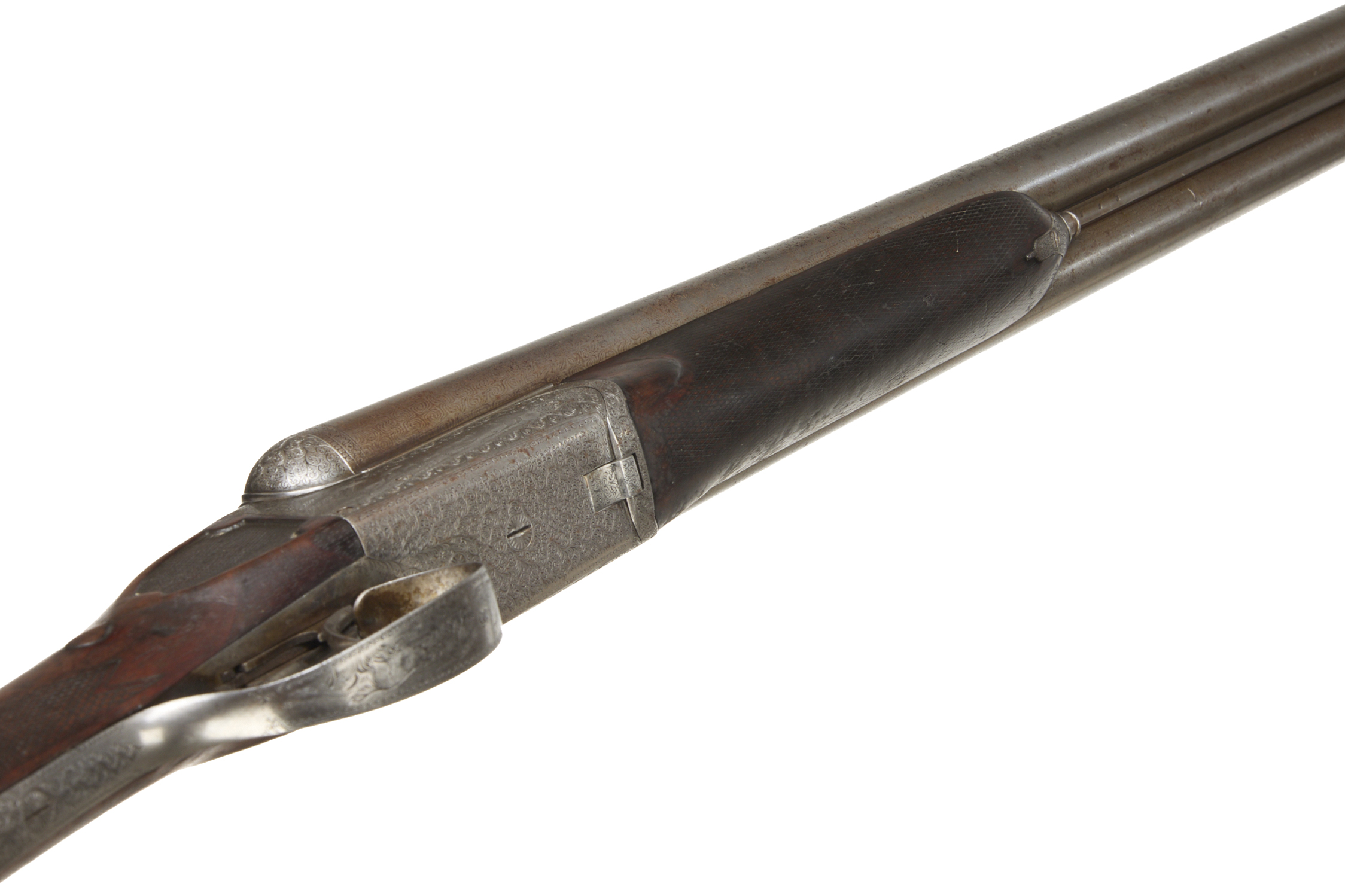 Finely embellished steel tips to heel and toe, chequered butt straight grip and forend. Damascus, black powder proof barrels with broad rib, engraved ‘1’, ‘T. WILD. 35 WHITTALL STREET. BIRMINGHAM’. Cross-bolt extension, the action finely engraved with blackcock and pheasants amid a Highland scene to the sides, a bustard to the top lever and dogs to the trigger guard. The interstices filled with the finest acanthus scrolling. Wonderful. Black powder proof pre-1896.