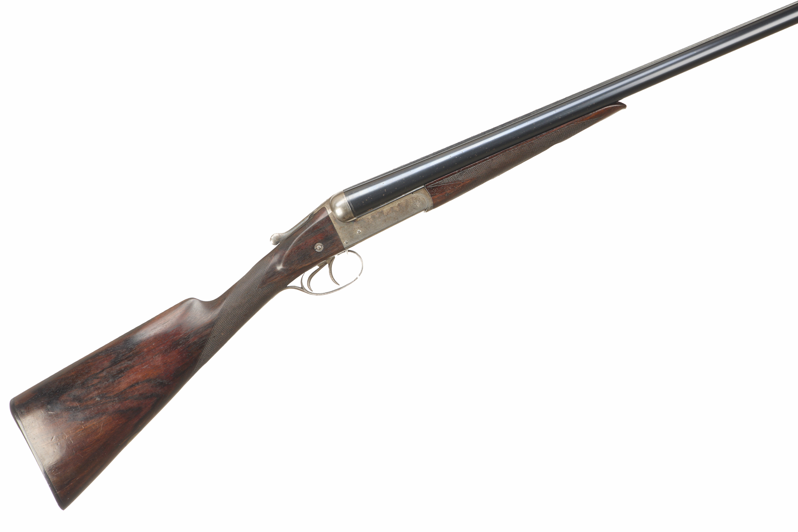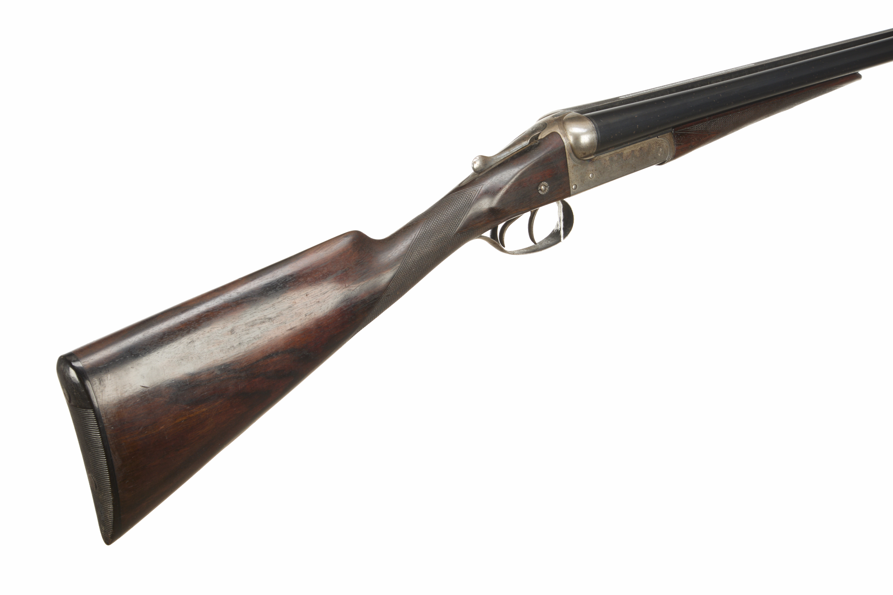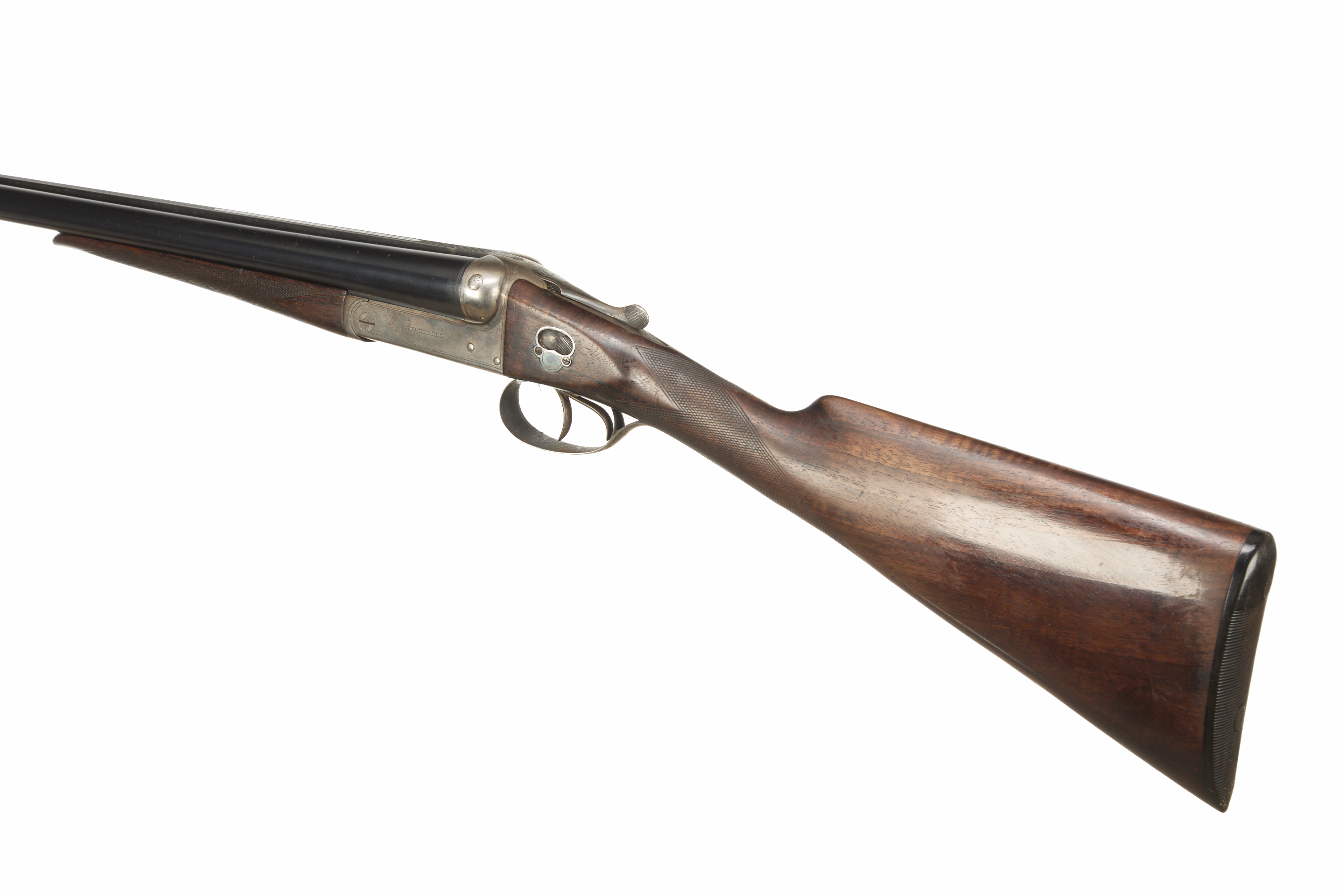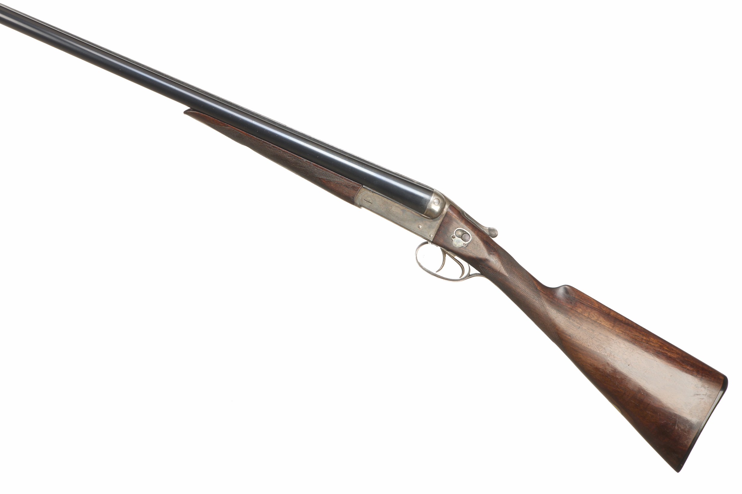 Ebonite butt, chequered straight grip and forend. Tapered machine finished rib engraved ‘W. W. GREENER. MAKER. 29 PALL MALL. LONDON. S.W. WORKS ST. MARY’S SQUARE. BIRMINGHAM’. Bead foresight. Double trigger, treble grip action, top lever, side thumb safety with ‘SAFE’ inlaid in gold. The action engraved with ‘W. W. GREENER’, otherwise unadorned.