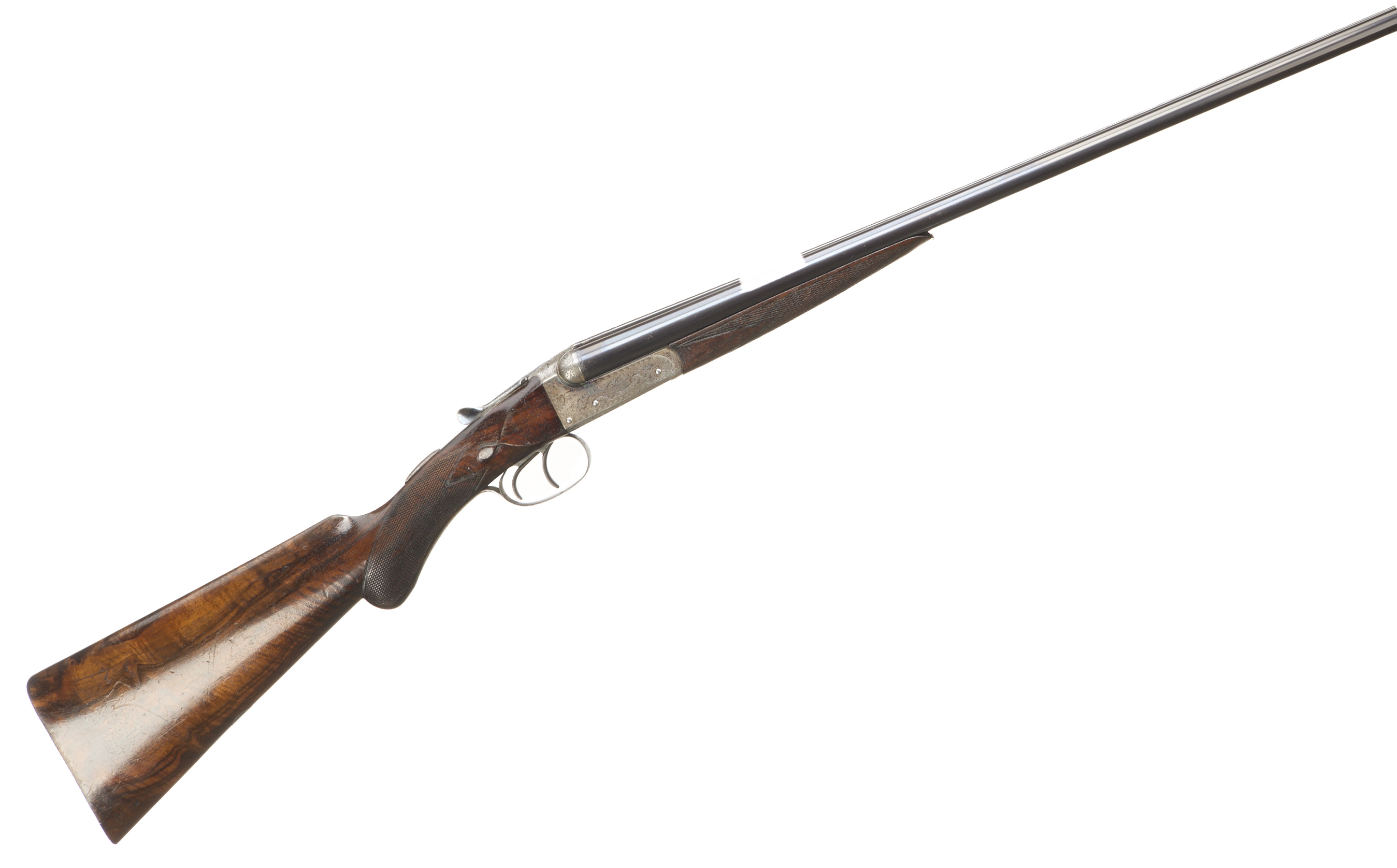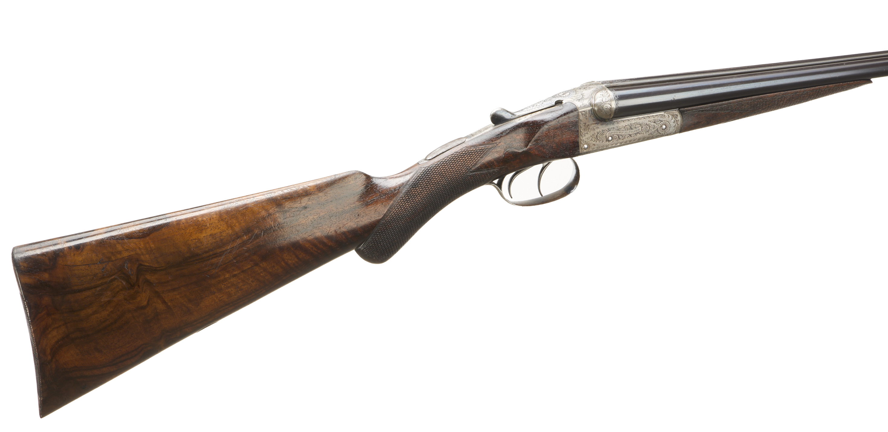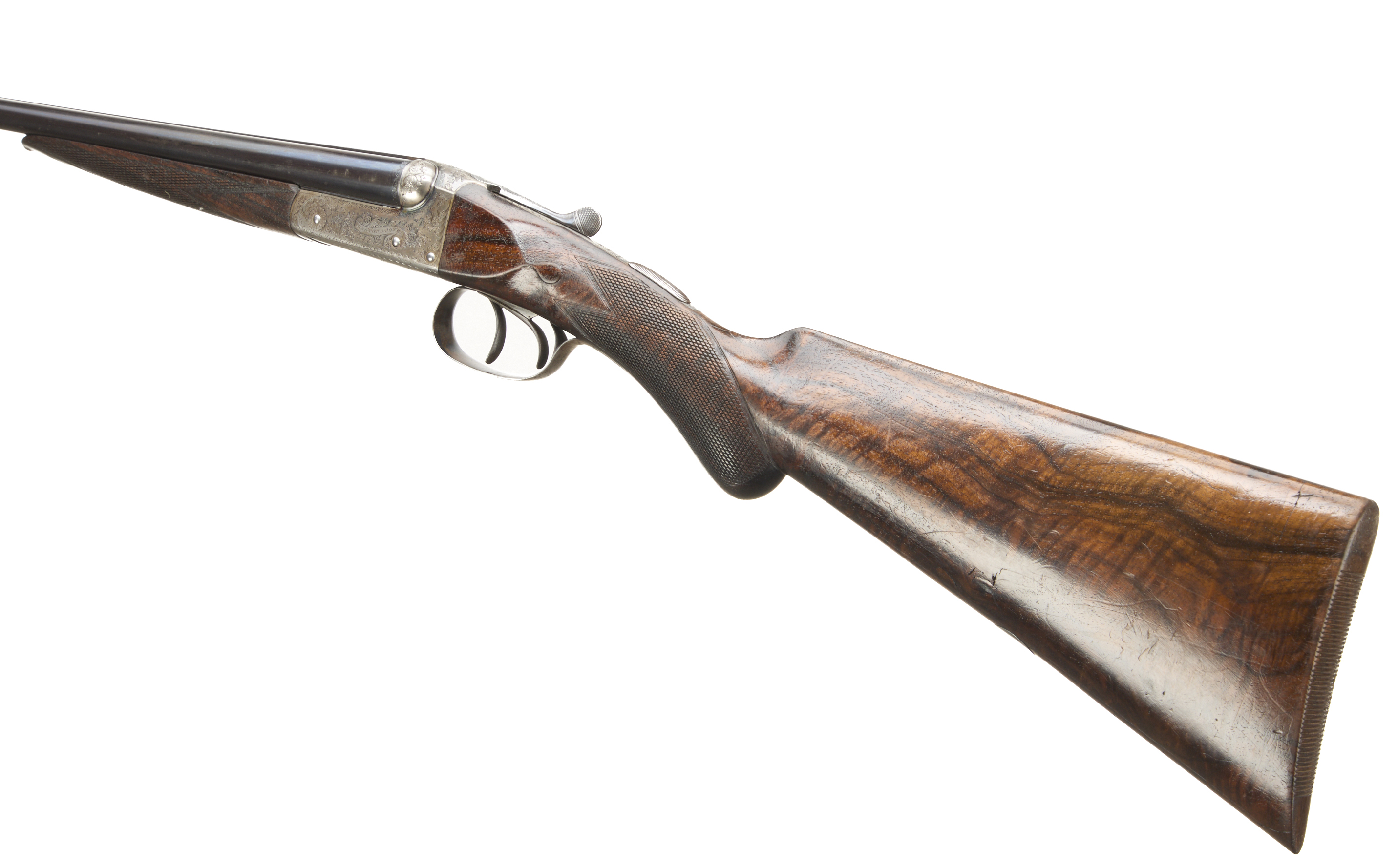 Additional Comments, Light silvering to muzzle, breech and edges of rib. A number of fine, light marks to the barrels. A little original colour remaining on the action below the fences, the engraving little worn. The stock richly figured, some exposed grain and deeper scratches, widely marked. The bores bright with some small frosted patches.