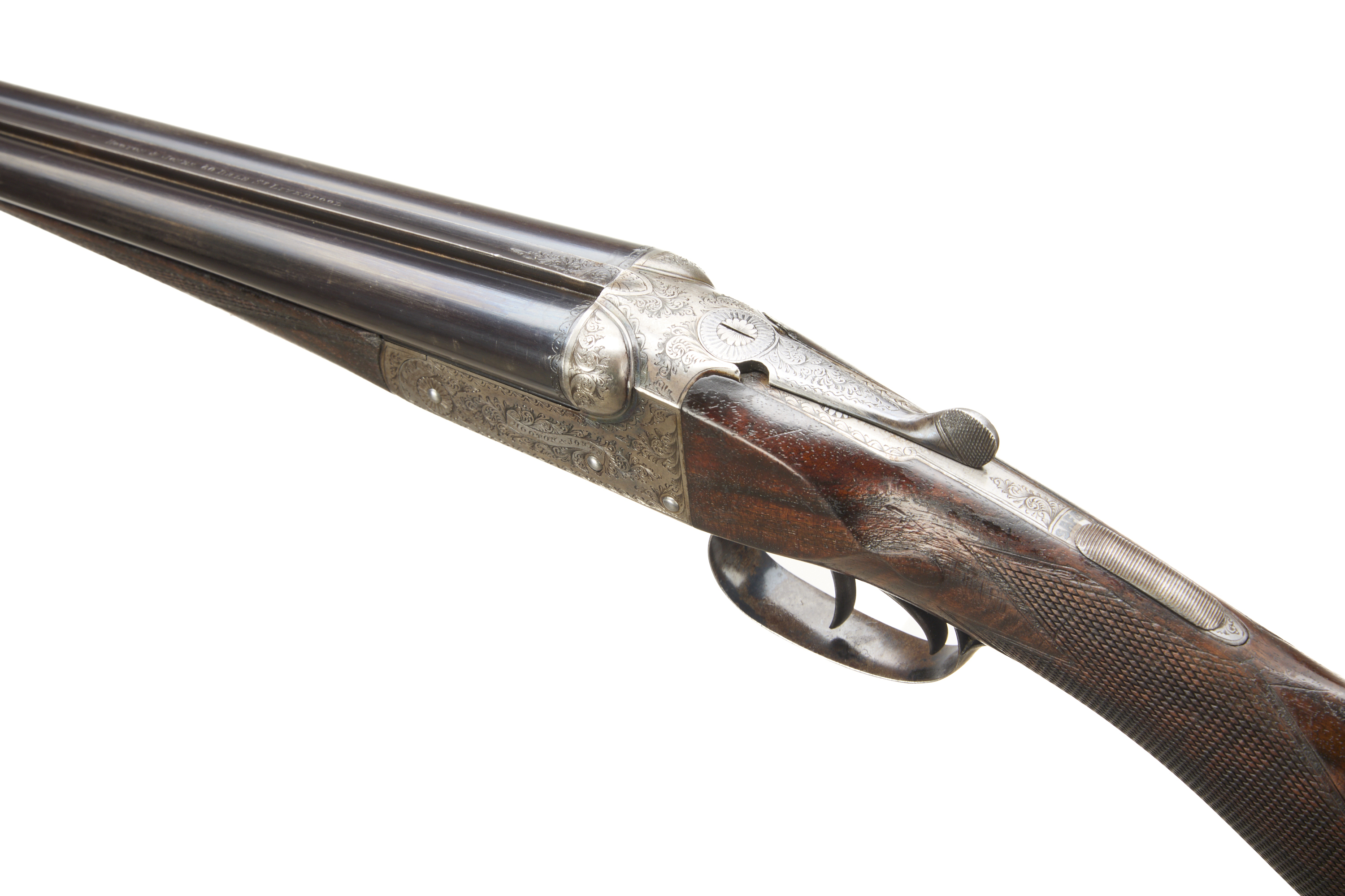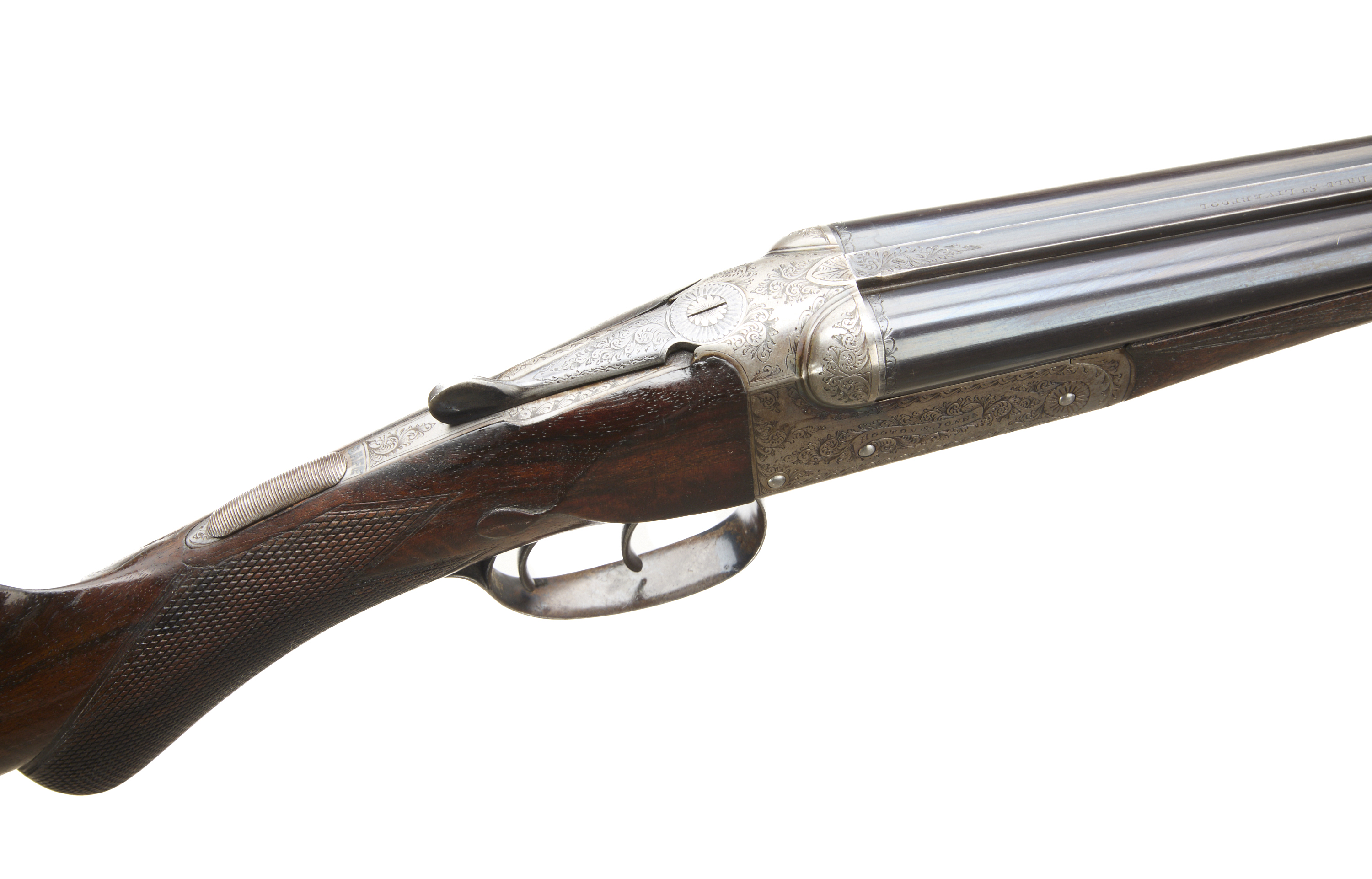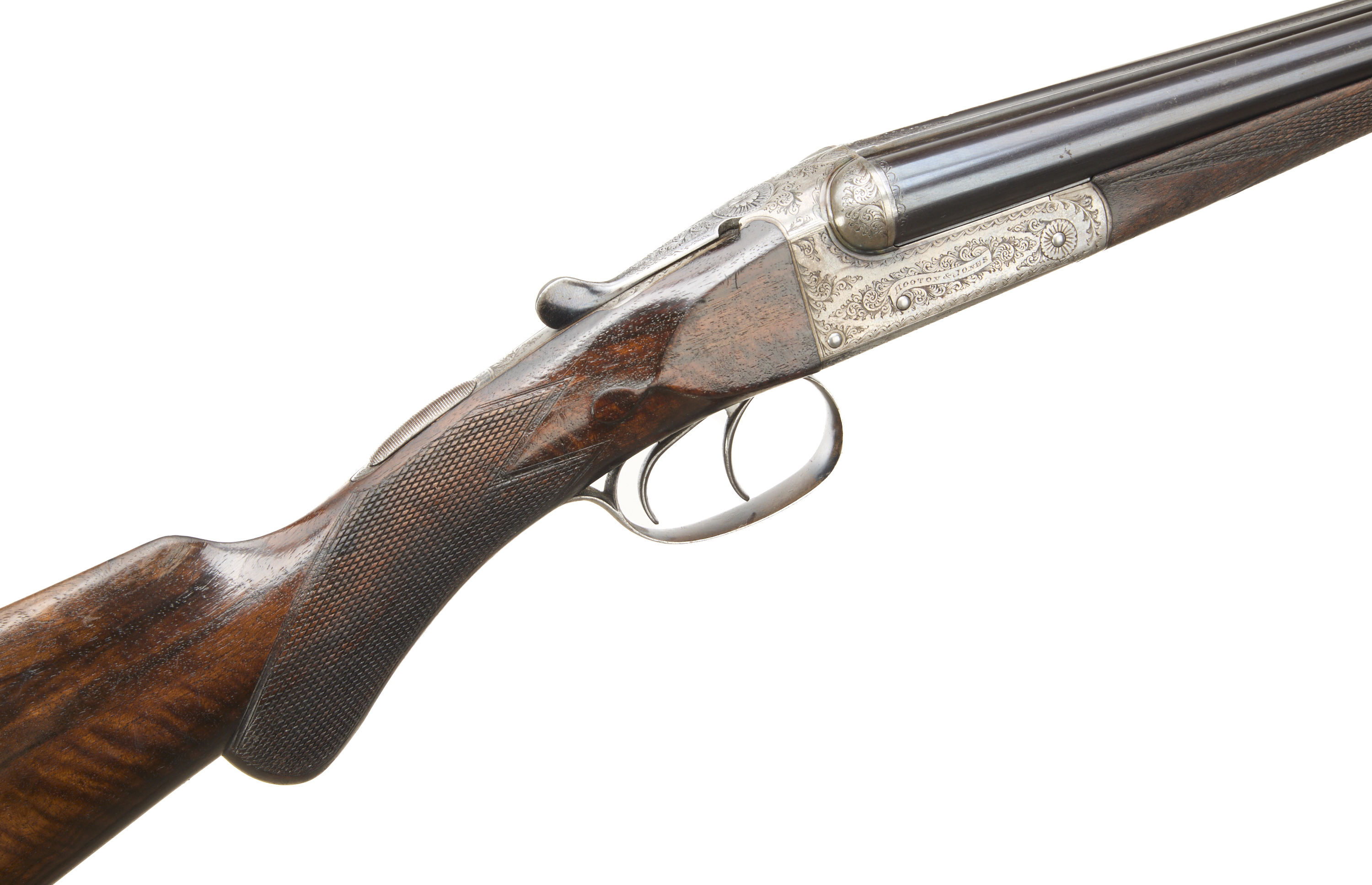 Chequered butt, richly figured, chequered rounded semi-pistol grip and forend. Plain, concave rib with embellishments to the breech end, engraved ‘HOOTON & JONES, 60 DALE ST LIVERPOOL’, hold-open top lever, automatic safety with ‘SAFE’ inlaid. The action engraved with acanthus scroll enhancements, of particular note to the fences, ‘HOOTON & JONES’ mounted on a scroll. In the manufacturer’s leather case, embossed ‘HEREWARD CLARE LEES’, with label and accessories.