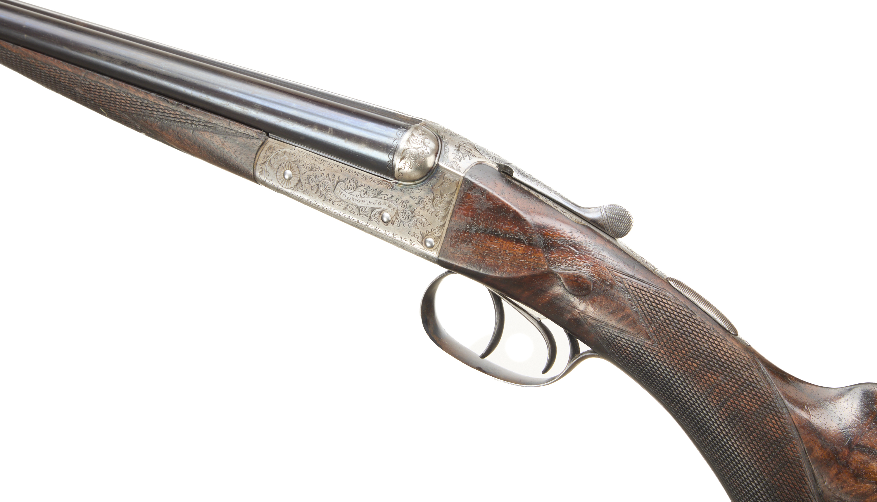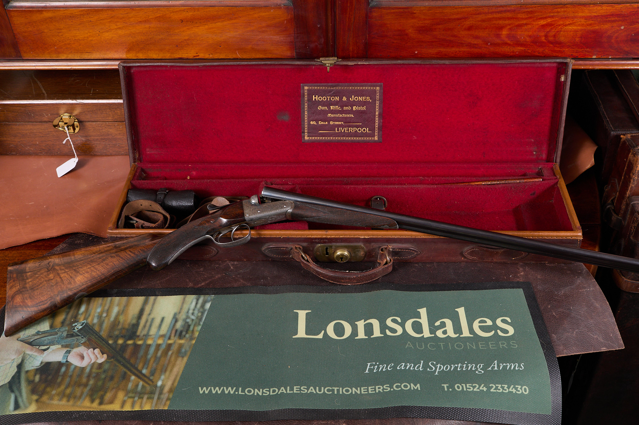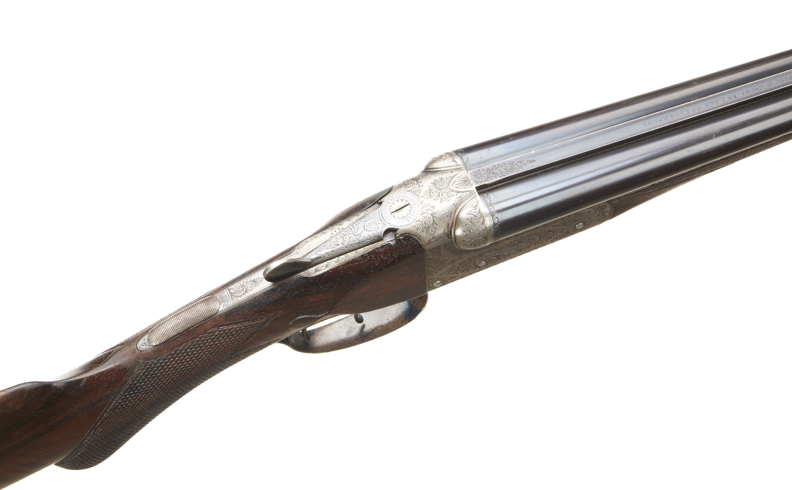 Chequered butt, richly figured, chequered rounded semi-pistol grip and forend. Plain, concave rib with embellishments to the breech end, engraved ‘HOOTON & JONES, 60 DALE ST LIVERPOOL’, hold-open top lever, automatic safety with ‘SAFE’ inlaid. The action engraved with acanthus scroll enhancements, of particular note to the fences, ‘HOOTON & JONES’ mounted on a scroll. In the manufacturer’s leather case, embossed ‘HEREWARD CLARE LEES’, with label and accessories.